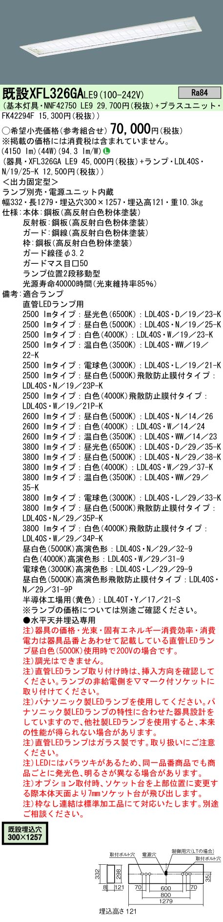 XFL326GALE9XFL326GALE9【商品画像のLEDランプは別売です。用途に応じ別途ご注文をお願いいたします。】ベースライト 一般形 LED電気工事必要 畳数設定無し埋込灯 リニューアル用 天井埋込型 40形 直管LEDランプベースライト ガード光源◆LDL40×2◆適合ランプ:直管LEDランプ用◆適合ランプ:1400 lmタイプ:昼白色(5000K):LDL40S・N/13/14◆適合ランプ:1400 lmタイプ:白色(4000K):LDL40S・W/13/13◆適合ランプ:2000 lmタイプ:昼白色(5000K):LDL40S・N/19/20◆適合ランプ:2000 lmタイプ:白色(4000K):LDL40S・W/19/19◆適合ランプ:2500 lmタイプ:昼光色(6500K):LDL40S・D/22/23◆適合ランプ:2500 lmタイプ:昼白色(5000K):LDL40S・N/22/25◆適合ランプ:2500 lmタイプ:白色(4000K):LDL40S・W/22/23◆適合ランプ:2500 lmタイプ:温白色(3500K):LDL40S・WW/22/22◆適合ランプ:2500 lmタイプ:電球色(3000K):LDL40S・L/22/21◆適合ランプ:2600 lmタイプ:昼光色(6500K):LDL40S・D/27/21◆適合ランプ:2600 lmタイプ:昼白色(5000K):LDL40S・N/25/26◆適合ランプ:2600 lmタイプ:白色(4000K):LDL40S・W/25/24◆適合ランプ:2600 lmタイプ:温白色(3500K):LDL40S・WW/27/20◆適合ランプ:2600 lmタイプ:電球色(3000K):LDL40S・L/27/19◆適合ランプ:2600 lmタイプ:昼白色(5000K)飛散防止膜付タイプ:LDL40S・N/27/22P◆適合ランプ:3400 lmタイプ:昼白色(5000K):LDL40S・N/33/34◆適合ランプ:3400 lmタイプ:白色(4000K):LDL40S・W/33/31◆適合ランプ:※ランプの価格については別途ご確認ください。 ◆ランプ色温度:5000 K ◆光源寿命40000時間(光束維持率85%)寸法・質量◆幅:332 mm ◆長:1279 mm ◆埋込穴幅:300 mm ◆埋込穴長:1257 mm ◆埋込高:121 mm◆質量:10.3 kg仕様・注意事項◆ランプ品名:LDL40S◆安定器出力型:定格出力型 ◆安定器補足:<出力固定型> ◆電圧:100〜242 V ◆消費電力:31 W ◆消費効率:79.4 lm/W◆全光束:2460 lm◆【本体】鋼板(高反射白色粉体塗装)◆【反射板】鋼板(高反射白色粉体塗装)◆【ガード】鋼線(高反射白色粉体塗装)◆【枠】鋼板(高反射白色粉体塗装)◆ガード線径φ3.2◆ガードマス目□50◆ランプ位置2段移動型◆Ra84◆●水平天井埋込専用◆入力電流(100V時):0.31 A◆入力電流(200V時):0.16 A◆入力電流(242V時):0.14 A◆注)器具の価格・光束・固有エネルギー消費効率・消費電力は器具品番とあわせて記載している直管LEDランプ昼白色(5000K)使用時で200Vの場合です。◆注)調光はできません。◆注)直管LEDランプ取り付け時は、挿入方向を確認してください。ランプの接地側を▽マーク付ソケットに取り付けてください。◆注)パナソニック製LEDランプを使用してください。パナソニック製LEDランプの特性に合わせた器具設計をしていますので、他社製LEDランプを使用すると、本来の性能が得られない場合があります。◆注)直管LEDランプはガラス製です。取り扱いにご注意ください。◆注)LEDにはバラツキがあるため、同一品番商品でも商品ごとに発光色、明るさが異なる場合があります。◆注)オプション取付時、ソケット台を上部位置に変更する際本体天面より7mmソケット台が飛び出します。◆注)連結する場合は器具の加工が必要です。別途お問い合わせください。関連商品:
