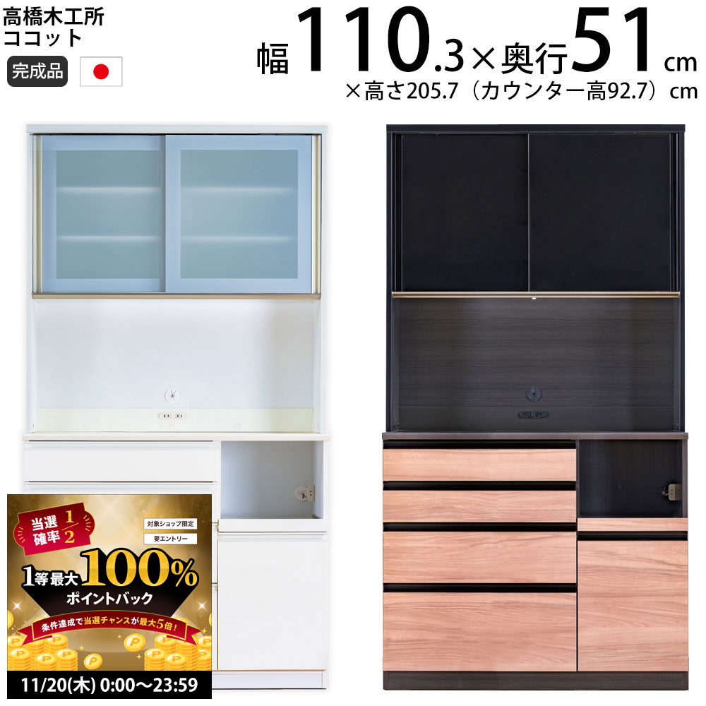 【11/20 2人に1人最大100%ポイントバック】高橋木工所 ココット キッチンボード 110 オープン 幅110.3×奥行51×高さ205.7cm ミドルハイカウンター 2個口 家電ボード 食器棚 新生活 日本製 完成品