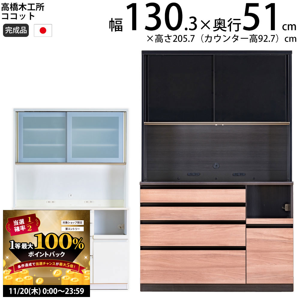 【11/20 2人に1人最大100%ポイントバック】高橋木工所 ココット キッチンボード 130 オープン 幅130.3×奥行51×高さ205.7cm ミドルハイカウンター 2個口 家電ボード 食器棚 新生活 日本製 完成品