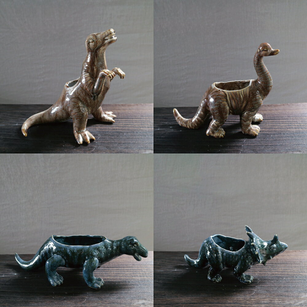 〇釉薬の温かみのある風合いと表面のゆるやかな凹凸。 〇今にも動き出しそうな恐竜たちは光の角度によって遊んでいるようにも戦っているようにも見えます。 宅配便でのお届けとなります。 こちらの商品はラッピング対応不可となっております。Earthy Pot 恐竜シリーズ (ティラノサウルス・ブラキオサウルス・スピノサウルス・トリケラトプス) 恐竜たちをモチーフにした植栽ポット フラワーベースとしても、観葉植物を収納しても利用可能。また、玄関のキーケースや小物入れにも良いかもしれません。 釉薬の温かみのある風合いと表面のゆるやかな凹凸、今にも動き出しそうな恐竜たちは光の角度によって可愛さと上品な雰囲気を感じます。 和室・洋室、リビング・玄関、場所や使用シーンを問わずお使いいただけるワンポイントアクセントアイテム。 手作りで作られていることや釉薬の塗装の工程上、個体差はございますが、同じものは二つとしてありません。その点も含めてこの商品の魅了として伝われば嬉しいです。 ティラノサウルス・ブラキオサウルス・スピノサウルス・トリケラトプスの4種類。若干ですがティラノサウルスが大き目に作られていますので比例して価格設定をしています。 1.恐竜をモチーフにした容器。 2.釉薬の独特な色合いで、唯一無二の世界観。 3.玄関・リビング・寝室などお部屋のどこにおいても絵になる。 商品名 Earthy Pot 恐竜シリーズ (ティラノサウルス・ブラキオサウルス・スピノサウルス・トリケラトプス) サイズ ティラノサウルス 約W220×D130×H214mm ブラキオサウルス 約W222×D100×H185mm スピノサウルス 約W300×D103×H90mm トリケラトプス 約W226×D90×H112mm 材質 磁器 注意事項 ●食器ではございません。 ●塗装や形状にムラがありますが手づくりの風合いとしてお楽しみください。 ●屋外などご使用になる場所によって色が薄れていく場合があります。 ●引きずるとテーブルをキズつけることがありますのでご注意ください。 ●直接食品を入れないでください。