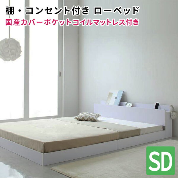 フロアベッド セミダブル 棚付き コンセント付き 国産カバーポケットコイルマットレス付き ローベッド ホワイト 低いベッド マットレスセット セミダブルベッド ロースタイル (IDEAL アイディール) 送料無料