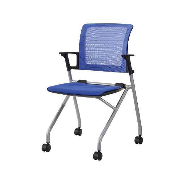■サイズ・色違い・関連商品■ブルー[当ページ]■グリーン■オレンジ■商品内容コンパクトながら、体圧分散の座面で座り心地の良い平行スタッキングチェア。ハーフ肘付きでカバンなどのちょっとした荷物をかけられます。■商品スペック【サイズ(約)】●外形寸法(幅)[mm]:548●外形寸法(奥)[mm]:552●外形寸法(高)[mm]:841●質量[kg]:6.5●色:ブルー●座面高[mm]:430●座面寸法(幅)[mm]:435●座面寸法(奥)[mm]:375●平行スタッキングピッチ[mm]:165●材質:背(張地/芯材)=メッシュ(ポリエステル)/ナイロン、座(張地/芯材)=布(ポリエステル)/ポリプロピレン、クッション=ウレタンフォーム、脚=直径25.4mmスチールパイプ(粉体塗装・シルバー色)、肘=ナイロン、キャスター=ナイロン双輪キャスター●機能:平行スタッキング、キャスター付■送料・配送についての注意事項●本商品の出荷目安は【3 - 6営業日 ※土日・祝除く】となります。●お取り寄せ商品のため、稀にご注文入れ違い等により欠品・遅延となる場合がございます。●本商品は仕入元より配送となるため、沖縄・離島への配送はできません。