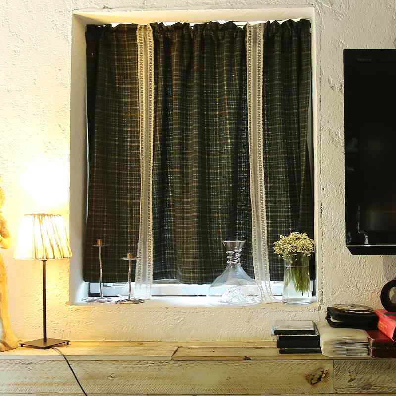 カフェカーテン おしゃれ アメリカン レトロ プリント チェック柄 リフト ドア 出窓 キャビネット 食器棚 キッチン リビング 玄関 寝室 遮光 間仕切り 防塵 目隠し インテリア 装飾 レース 紐 緑