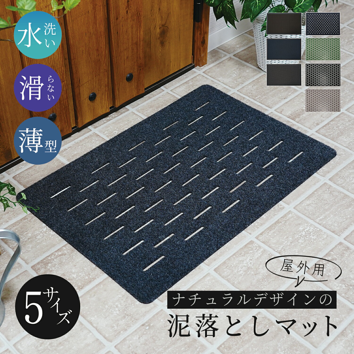 薄型玄関用泥落としマット サイズ 【リーフ・ライン】50×75 【グリーン・グレー・ブラック】48×75 スペック 丸洗い可能・滑り止め カラー グリーン、グレー、ブラック 素材 ポリエステル・TPE(熱可塑性エラストマー) その他注意点 ・乾燥機は使用せず、風通しの良い場所で自然乾燥させてください。 ・漂白剤や強い洗剤の使用は避けてください。 ・アイロンの使用は避けて下さい。ラバー部分が溶け出す場合がございます。・ブラシ付きはアイアンのみになっております。ご了承下さい。 商品用途 玄関マット,屋外,滑り止め,おしゃれ,薄型,TPE素材,水洗いOK,掃除しやすい,泥落とし,洗える,ブラシ構造,防汚,吸着,グリップ力,抗菌,耐久性,エントランス,汚れ防止,インテリア,モダン,北欧風,雨対応,雪対応,アウトドア,ペット対応,引っ掛かりにくい,新生活,戸建て,マンション,掃除簡単,丈夫,ドア下対応,コンパクト,快適,安全設計,50×75,48×75実用性にもこだわった高機能マット 汚れに強く、お手入れ簡単 薄型玄関用泥落としマット【5種類】 泥汚れをしっかり落とすブラシ状の凹凸パターンが特徴のタイプと細かなブラシのついた玄関用泥落としマットです。砂や泥がついた靴もこのマットの上でしっかり落とせます。さらに、掃き掃除はもちろん、ホースで水洗いしたりブラシでゴシゴシ洗えるので、いつでも清潔をキープできます。 従来品に比べて薄型設計のため、玄関ドアに引っかかりにくく、より多くのご家庭で使いやすくなっています。デザインは全5種。モダン・シンプル・ナチュラルなど、玄関の雰囲気に合わせてお選びいただけます。 RECOMMEND! この商品の関連アイテム一覧 ラバー玄関マット 屋外用【4種類】 1,980 円~ 送料無料 洗える玄関マット 880 円 水洗いできる玄関マット 4,980 円 送料無料 TPE素材の玄関マットがさらに使いやすく 高機能素材「TPE(熱可塑性エラストマー)」を使用し、優れた滑り止め効果を実現。濡れた靴でも滑りにくく、雨の日や雪の日でも安心・安全にご使用いただけます。 マットのズレを防ぐので、ご家族はもちろんご来客にも快適な玄関を提供します。 表記サイズ(cm) 【リーフ・ライン】50×75 【グリーン・グレー・ブラック】48×75 【ラッシュ/ブラウン・ネイビー・グレー】50×70・60×90・80×120 素材 ポリエステル・TPE(熱可塑性エラストマー) 清掃・その他注意点 ・乾燥機は使用せず、風通しの良い場所で自然乾燥させてください。 ・漂白剤や強い洗剤の使用は避けてください。 ・アイロンの使用は避けて下さい。ラバー部分が溶け出す場合がございます。・ブラシ付きはアイアンのみになっております。ご了承下さい。 備考 玄関マット,屋外,滑り止め,おしゃれ,薄型,TPE素材,水洗いOK,掃除しやすい,泥落とし,洗える,ブラシ構造,防汚,吸着,グリップ力,抗菌,耐久性,エントランス,汚れ防止,インテリア,モダン,北欧風,雨対応,雪対応,アウトドア,ペット対応,引っ掛かりにくい,新生活,戸建て,マンション,掃除簡単,丈夫,ドア下対応,コンパクト,快適,安全設計,50×75,48×75