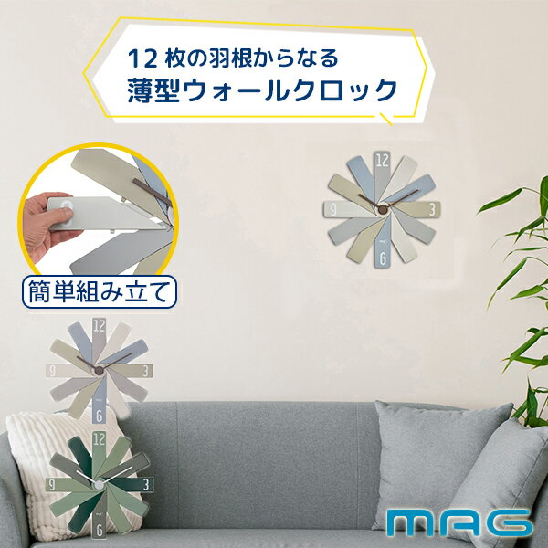 12枚の羽根がおしゃれなデザイナーズクロック 羽色を自由に移動できる本体組み立て式 デザイナー:Andreas Bruckner(1960年~) プレゼントにも最適なコンパクトなBOXパッケージ 本体サイズ:縦40.0横40.0奥行4.2、335g