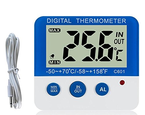 ★★送料無料(メール便にて発送致します) メール便は到着日・時間の指定は出来ません。 厚み制限の為、梱包時の緩衝材は使用しない場合がございます。 予めご了承下さいませ。 かんたん操作 高精度デジタル水温計 高性能 水槽の温度や冷蔵庫冷凍庫の温度管理に シンプルなデザインで簡単操作 表示が非常に見やすいです。 便利なアラーム機能付き 高低温警報がご設定いただけます。温度が下がったりまた温度が高くなる時、アラームとLED点灯で知らせます。 水槽でお使いの場合は大切なペットを安心して守る事が出来ます。 ◆LCD画面表示で見やすい ◆内部温度範囲:-10~50℃ ◆外部温度範囲:-50~70℃ ◆温度精度:+/-0.5℃ ◆外部・内部温度の同時測定、IN/OUTボタンを押すと外内部温度の表示が切替ます ◆高低外部温度アラーム機能 ◆MIN/MAX外部内部温度の記憶機能、MIN/MAXボタンを押すとデータを簡単にチェックできます。 ◆初期設定された霜点警報温度:-1~4℃ ◆LEDインジケータライト ◆防水外部温度センサー(1m 取り外し可能) ◆卓上スタンドまたはスチール面に貼り付け裏面マグネット付 仕様 素材: ABS樹 本体サイズ:長さ65×幅18×高さ60mm 防水外部温度センサー:1m 重量:80g カラー:ブルー 梱包内容: 1 ×C601温度計 1 ×LR44ボタン電池(テスト用) 1 ×防水外部温度センサー *異常表示が発生した場合は、電池を取り出して2秒後に電池を戻してから、 通常の表示に戻ります。【送料無料】メール便での発送予定となります