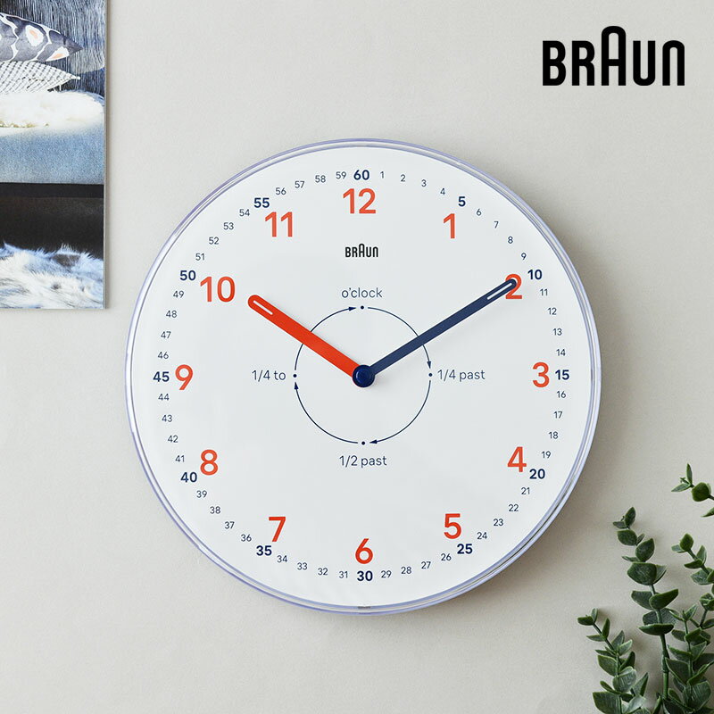 ※メーカー希望小売価格はメーカー商品タグに基づいて掲載していますTime Teacher / タイムティーチャー 子供が時間の数え方、時計の読み方を学びながら、大人もインテリアとしても楽しめる、これまでにない新しいアプローチのデザインを採用した「タイムティーチャー」シリーズ ホワイトダイヤルにオレンジとブルーの配色が見やすくて楽しいクロックは、ただ時刻を知るだけではなく、子供たちが時間の数え方、時計の読み方を学ぶことができます。 そのため、メモリにはオレンジの12進法表記に加え、外側に60進法の細かい数字がふられています。 また、内側の円の周りには「past」や「to」の文字が記載され、英語での時間の読み方を学ぶことができます。 BC26シリーズ 直径23cm、風防をまとった少し厚みのあるボディとミニマルなデザインの掛け時計。 余計な装飾がなく、時針と分針の先端には蓄光素材を採用しているのでいつでもクリアな視認性が確保できます。 子供部屋はもちろん、リビングやキッチン、ベッドサイドに置いてもインテリアとして、楽しく明るい雰囲気の部屋を演出します。 入学や進学のお祝い、お引越しのギフトにもおすすめです。 〈 置き時計タイプ はこちら 〉 商品情報 商品名:タイムティーチャー ウォールクロック ブランド:BRAUN(ブラウン) サイズ:約 直径 23 cm × 奥行 3.5 cm 重 さ:約 313 g 素 材:プラスチック ムーブメント:クオーツ(静音設計)・スイープ運針 付属品:正規保証書 保 証:お買い上げから1年間 その他 ※単三電池1本(別売り)により作動 ※電池をお使いいただく際にPanasonic製のエボルタ、または「充電式(1.2V)」では、電圧不足のため不具合が生じる場合がございます。上記以外の乾電池をご使用下さい。 ※化粧箱は輸送中の揺れなどにより、軽度な表面のキズや角のつぶれが生じる場合がございます。何卒ご理解いただけますと幸いです。 ※ご覧頂く環境により色・素材の見え方などが実際の商品と多少異なることがございます。 家電デザインに革命をもらたしたBRAUN(ブラウン)。色褪せる事の無いその究極の造形美は、巨匠”ディーター ラムス”の「Less,but better=より少なく、しかしより良く」の哲学のもとに創り上げられました。”機能主義”を一貫し、革新的なデザインを数多く輩出したBRAUNの家電製品は今も尚、色褪せる事のない造形物として、デザイナーやコレクターを魅了し続けています。