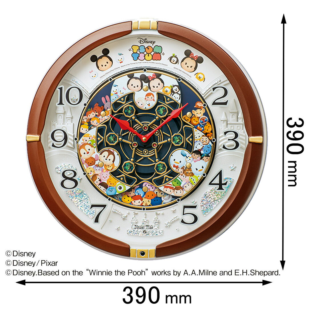 □「返品種別」について詳しくはこちら□2019年11月 発売【セイコー クロック 延長保証サービスのお知らせ】「2024年 6月 1日」以降ご注文分より延長保証サービスがスタートしております。「2024年 6月 1日」以降メーカー出荷分よりご登録用の二次元コード付きのチラシ、もしくは保証書が同梱されますが弊社在庫分につきまして同梱されておりませんのでメーカーサイトにてご確認の上、ご登録をお願いいたします。メーカー保証期間 1年◆付属の電池はお試し用電池になります。 ダイナミックなパフォーマンスが魅力のからくり時計毎正時になると、メロディとともに文字板がゆっくりと回転を始めます3つのサークルは曲調に合わせて右回転・左回転を繰り返し、華やかなパフォーマンスを繰り広げます◆設置場所を選ばないクオーツムーブメントを採用 標準電波の届かない場所でも、針廻しで簡単に時刻合わせができるクオーツムーブメントを採用しています◆メロディ音量調節◆自動鳴り止め機能 光センサーの働きにより、周囲が一定以下の暗さになると毎正時のメロディ・パフォーマンスを自動的に停止させます◆報時モニター 下部のモニターボタンを押すと、メロディ・パフォーマンスを再生出来ます◆メロディ再生 毎正時に流れるメロディを、3つのグループからセレクトできます【グループA】 メイク・ア・ウィッシュ スターリー・アイズ メリー・ゴー・ラウンド トワイライト・ファンタジー ブルーミング レインボー・プロムナード【グループB】 春(「四季」) カノン ペールギュントより「朝」 花のワルツ 交響曲第9番 歓喜の歌 時の踊り アメイジング・グレイス ジュピター(「惑星」) マイスタージンガー グリーンスリーブス 美しき青きドナウ ブラームスの「ワルツ第15番」 アイネ・クライネ・ナハトムジーク 交響曲第6番 田園 乾杯の歌 愛の挨拶 プロムナード(「展覧会の絵」) あし笛の踊り(「くるみ割り人形」)【グループC】 ひいらぎ踊ろう もみの木 ウィー・ウィッシュ・ユー・ア・メリー・クリスマス もろびとこぞりて きよしこの夜 ジングルベル◆使用温度範囲:−10℃〜50℃◆付属品:掛用金具(木ネジ・石膏ボード用)、取扱説明書、保証書、単二マンガン電池×4本(モニター用)【ディズニー ツムツムとは】積み上げて楽しめるディズニーストアのぬいぐるみ「TSUM TSUM」シリーズと、同キャラクターをテーマとしたスマートフォン向けアプリゲーム「LINE:ディズニー ツムツム」が人気となっている、日本で生まれたコンテンツです■ 仕 様 ■精度:平均月差 ±20秒枠材:プラスチック(茶メタリック塗装)前面:ガラスサイズ:直径390×厚さ96mm重さ:2100g電池:アルカリ乾電池 単2×4本電池寿命:約1年(C)Disney(C)Disney/Pixar(C)Disney Based on the “Winnie the Pooh” works by A.A.Milne and E.H.Shepard.時計>掛時計>枠の形で選ぶ>丸形>ブラウン系・まごころ長期修理保証(保証5年)[加入料:対象商品代金の5%]商品「FW588B」専用加入料(※加入料のみ注文不可)※対象商品と専用加入料を分けてのご注文は承れません。上記リンク先の専用加入料と一緒にご注文して下さい。※長期修理保証についての詳細・注意事項はこちらのページをご一読下さい。