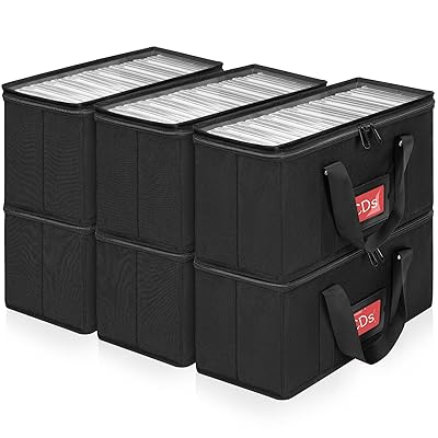 DVD収納 CD 透明 収納ケース 透明窓 ラベルポケット ハンドル メディアオーガナイザーバッグ ブルーレイディスク CD/DVD 映画ケース VHSボックス 積み重ね 大容量 防塵 ブラック (CDケース-6件装 186枚収納可能)