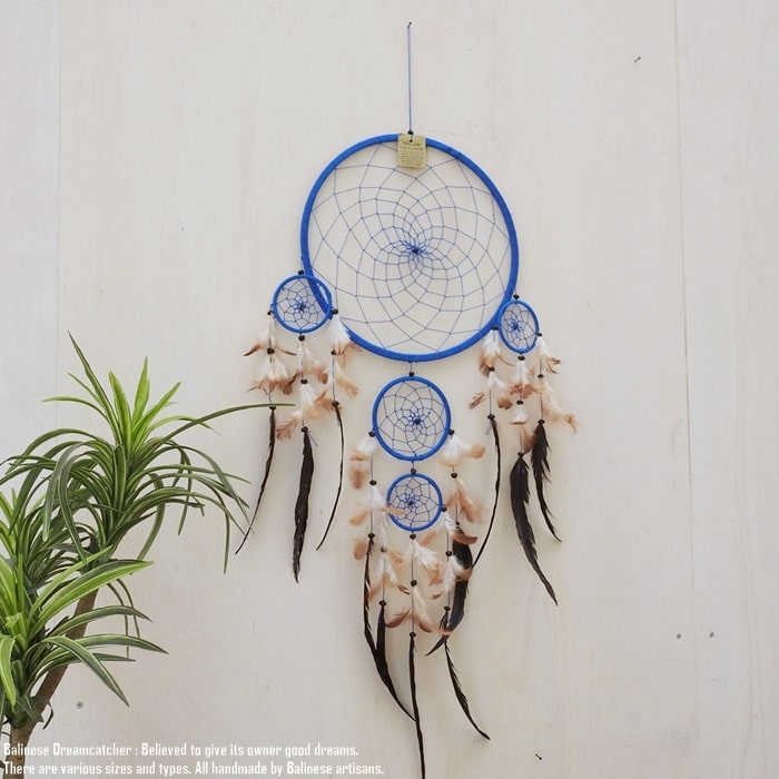 バリ島の職人が1点ずつ手作りしたドリームキャッチャーXXLサイズのブルーです。 ドリームキャッチャーとは、良い夢が見られるようにという想いが込められたインディアンのお守りの一つです。 現在ではお部屋のアクセントとなるインテリアとしても大変人気があります。 たくさん付いた羽がふんわりと揺れて可愛い♪ アジアンな雰囲気だけでなく、マリン風インテリアにもおすすめ! ※ハンドメイドの為、同じ製品でも多少仕上がりに違いがございます。予めご了承ください。 ■円の直径:大32cm、中11.5cm、小7.5~8cm ■幅(最大部):48~50cm ■奥行:0.7cm (羽を入れると8~10cm) ■長さ:102~110cm ※多少の計測誤差はお許しください。 ■カラー:ブルー ■素材:ナイロン・フェザー・ウッドビーズ ■原産地:インドネシア・バリ島〓 ドリームキャッチャー32cm XXLサイズ 青 〓