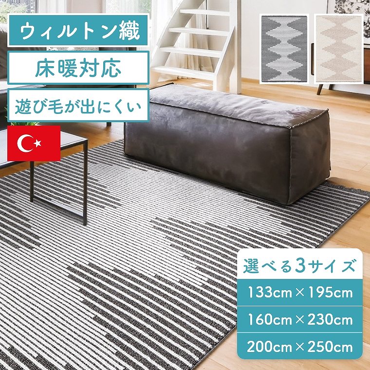ラグ シンプル【200×250】【160×230】【133×195】ホットカーペット 床暖 ウィルトン織 気持ちいい フリンジ 幾何学柄 ポリエステル ブラック ホワイト ベージュ おしゃれ 北欧 モダン 白 黒 ナチュラル センターラグ 遊び毛が出にくい トルコ製 客間 ジータ プレーベル