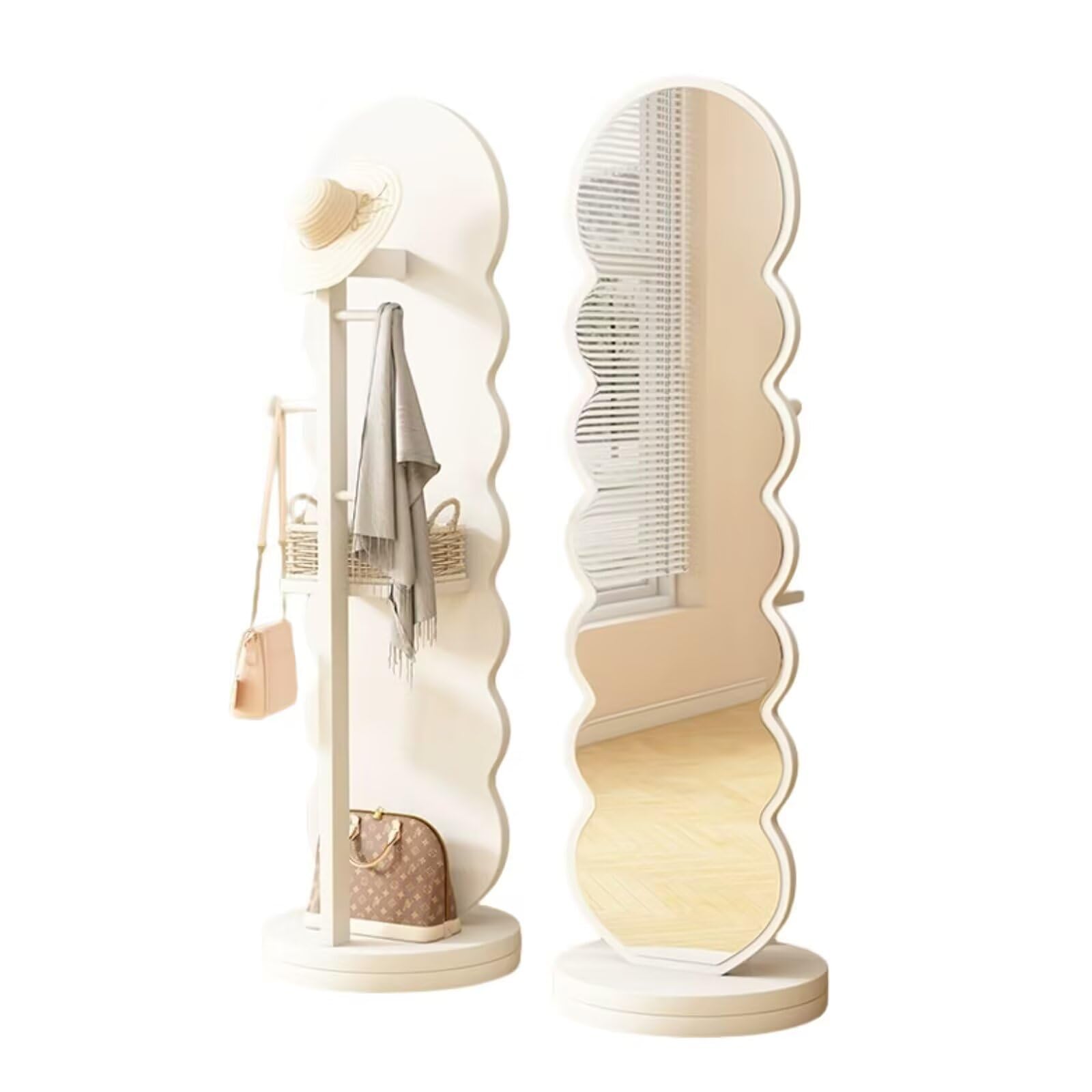 全身鏡 姿見鏡 ハンガーフック イレギュラ アーチ形 ハンガーフック付き鏡 ハンガー 360°回転可能なキャスター付き 北欧 収納付き 衣類収納 隙間収納 リビング 玄関 飛散防止加工 ホワイト 167*37CM 172*44CM