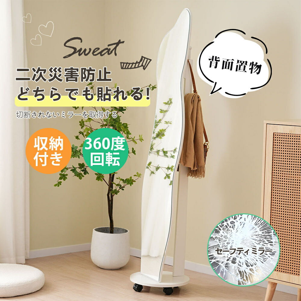 素材:プリント紙化粧繊維板 ベース底にはキャスターが付いています。鏡:飛散防止加工 お客様組立品 ※組み立ては、2人以上での作業をおすすめします お出かけ前は姿見でコーディネートチェック。姿見&収納付きの便利なハンガーフック。 360°回転可能なキャスター付き。ストッパー付きキャスター。自由に動かせるから移動も楽々。更に前面のキャスター2 個はストッパー付き。 ミラ一だけじゃない、裹には収钠スべ一又が付いていま寸。ミラーとハンガーが一緒になった省スペース仕様。回転するので服を取ってすぐに鏡で確認できる。 玄関先やリビング、ひとり暮らしの书部屋などどんなお部屋にも合わせやすいシンプルなデザインです。 ミラ一背面に洋服がすっきりと収納でき、かばんや小物の収納も考えたデザインに仕上がっています。 【飛散防止加工】万が一、割れてしまっても破片が飛び散りにくい加工がされているので、もしもの時は安心安全です! "模様替えや掃除の時などちょっと動かす時に便利なキャスターが付いています。ミラーの裏側にあるハンガーバイプから衣類を取り出す時に簡単に角度を変えて取り出す事ができます。 動かす必要がない場合は前2輪にロック機能が備わっていますので固定すれば不意に動かず、安全にこ使用頂けます。 ご注意:移動する際には、両手を使って、移動する必要があります。