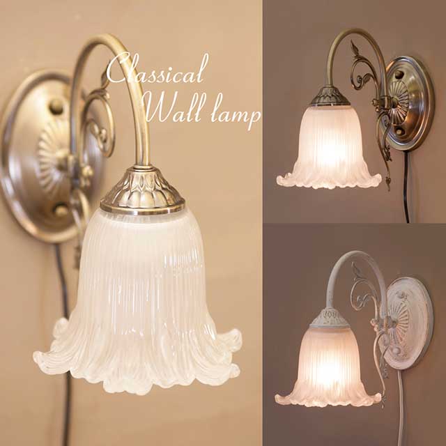 曲線のデザインが美しい、1灯ウォールランプゆるやかなカーブを描くデザインがアンティークなムード漂う壁付けランプ。一見シンプルでクラシカルな形は、アーム部分に繊細な装飾をあしらったこだわりのデザイン。ランプシェードはお花モチーフで部屋を優しく彩ります。※商品は「組立式」となります。■商品サイズ/約 幅15・奥行29・高さ23cmコード長:約170cm●重量:1kg●梱包サイズ(縦・横・高さ):26cm x 20cm x 26cm■品質/〔本体〕アイアン、ガラスシェード〔電球〕E26 40W(水雷型)電球1個付き(最大60Wまで対応)※中間スイッチ付き●中国製※メーカーお届け品※組立式●組み立て時間の目安:5分※室内用照明でございますので、屋外での使用はできません。※LED使用可能ですが、調光タイプのスイッチ、ホタルスイッチには対応しておりません。チラつきなどの原因となります。※ご購入の前に取り付け場所のスイッチをご確認ください。調光タイプのスイッチでご使用の場合は白熱球電球をご使用ください。※日時指定不可【注意事項】※こちらの商品はメーカー直送商品となります。※沖縄・離島へのお届けは行っておりません。※北海道へのお届けは追加送料が発生いたします。 追加送料につきましては、当店より追加送料をお見積りのうえ、メールにてご案内いたします。内容をご確認のうえ、1週間以内にご返信ください。■大型商品をご注文の際の注意事項※商品のサイズや重さ等を目安に玄関口(エレベータ)で搬入が可能か事前に確認をお願いします。※重機やクレーンを使っての搬入は承っておりません。※搬入ができずに返品となる場合は、往復運賃を請求する場合がございます。予めご了承ください。曲線のデザインが美しい、1灯ウォールランプクラシカルウォールランプ1灯(イザベラ)ゆるやかなカーブを描くデザインがアンティークなムード漂う壁付けランプ。一見シンプルでクラシカルな形は、アーム部分に繊細な装飾をあしらったこだわりのデザイン。ランプシェードはお花モチーフで部屋を優しく彩ります。※商品は「組立式」となります。