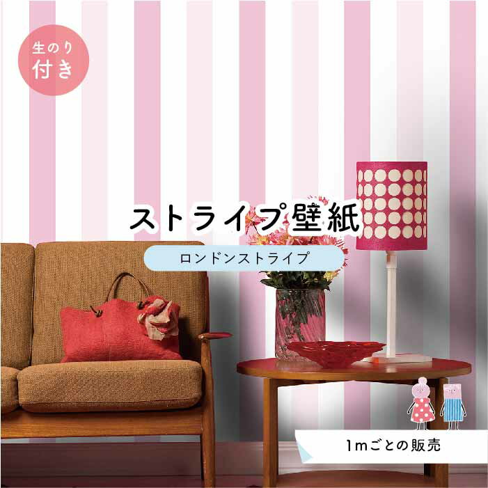 【1m単位 切り売り】【ストライプ幅11.25cm】 壁紙 ストライプ 太め インテリア 国産壁紙 のり付き アクセントクロス ピンク かべがみはるこ センとマル ロンドンストライプ 【lst0013n】