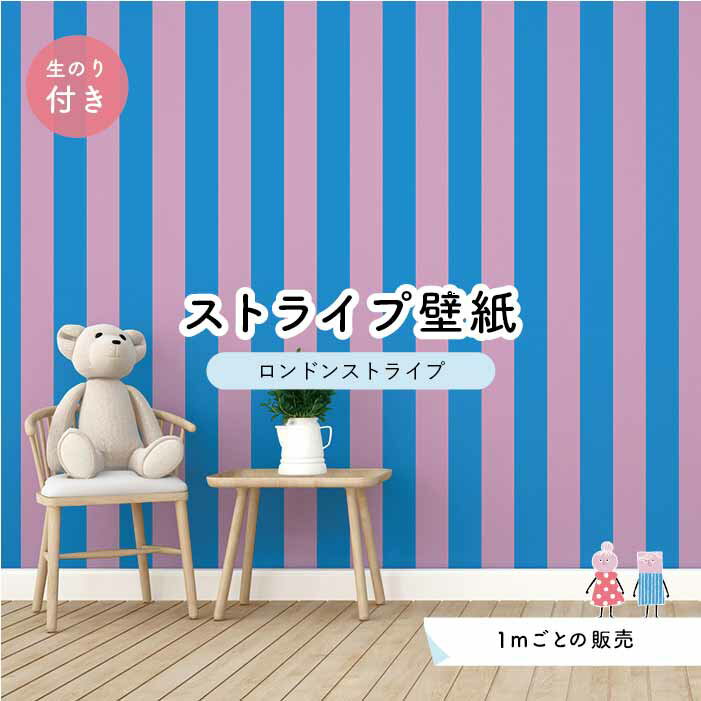 【1m単位 切り売り】【ストライプ幅11.25cm】 壁紙 ストライプ 太め インテリア 国産壁紙 のり付き アクセントクロス ピンク 水色 かべがみはるこ センとマル ロンドンストライプ 【lst0069n】