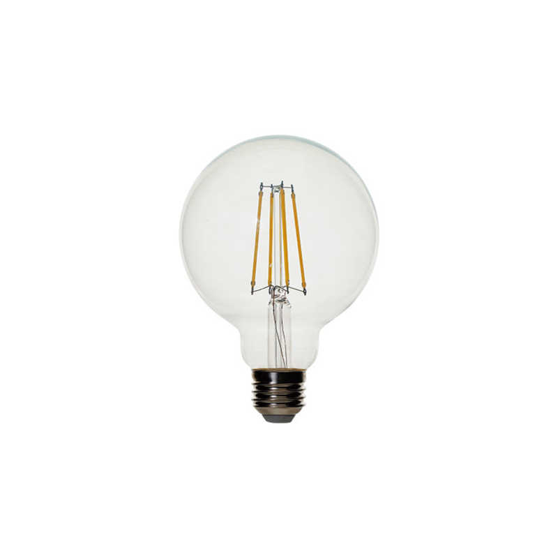 キラキラとした輝きで、光の美しさを際立たせるクリアガラス。大きな丸みあるフォルムは表面積が広い分、より目が疲れにくいやわらかな光を演出します。一般的なLED電球は光が下に向かいますが、LEDフィラメント電球は光が全方向に、均一に広がる特徴があります。そのためお部屋全体が柔らかく照らされ、リラックス効果は抜群。ころんとした丸さがかわいい大きめデザインは、ペンダントやランプシェードなど笠が広めの照明器具とベストマッチ。おしゃれなLEDフィラメント電球は、消灯時もお部屋の印象を格上げします。フィラメント電球の定格寿命は約25000時間。毎日点けるものだからこそ長寿命を実現しました。