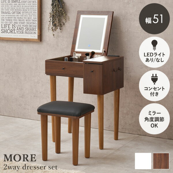 【20日21時〜3H★P10倍】ドレッサーセット 選べるLEDライトあり/なし 幅51cm【More】モア(ドレッサー デスク おしゃれ スツール付き コンセント付き テーブル 化粧台 コンパクト 鏡台 ミラー 収納 一面鏡 ドレッサーデスク ドレッサー