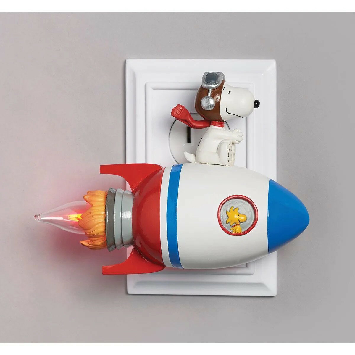 ※こちらの商品は通常在庫品です。 ※モニターにより、色の見え方が実際の商品と異なる場合がございます。 《重要》 弊社で取り扱っている商品は、海外からの輸入商品です。 海外輸入品は、箱にゆがみがある場合や、商品に若干の傷、汚れがあるもの、商品の精度が低いもの等がございます。 海外基準では不良品とならないため、当店でも不良品扱いはいたしませんのでご了承ください。【Snoopy Rocket Night Light with Flicker Bulb】 スヌーピーとウッドストックが乗ったロケット型のライトです。 スイッチを入れるとロケットの排気口が点滅し、ロケットが飛び立つ様子が再現されます。 サイズ:約15.24×10.8cm ※壁から約7.6cm離れます。 素材:樹脂
