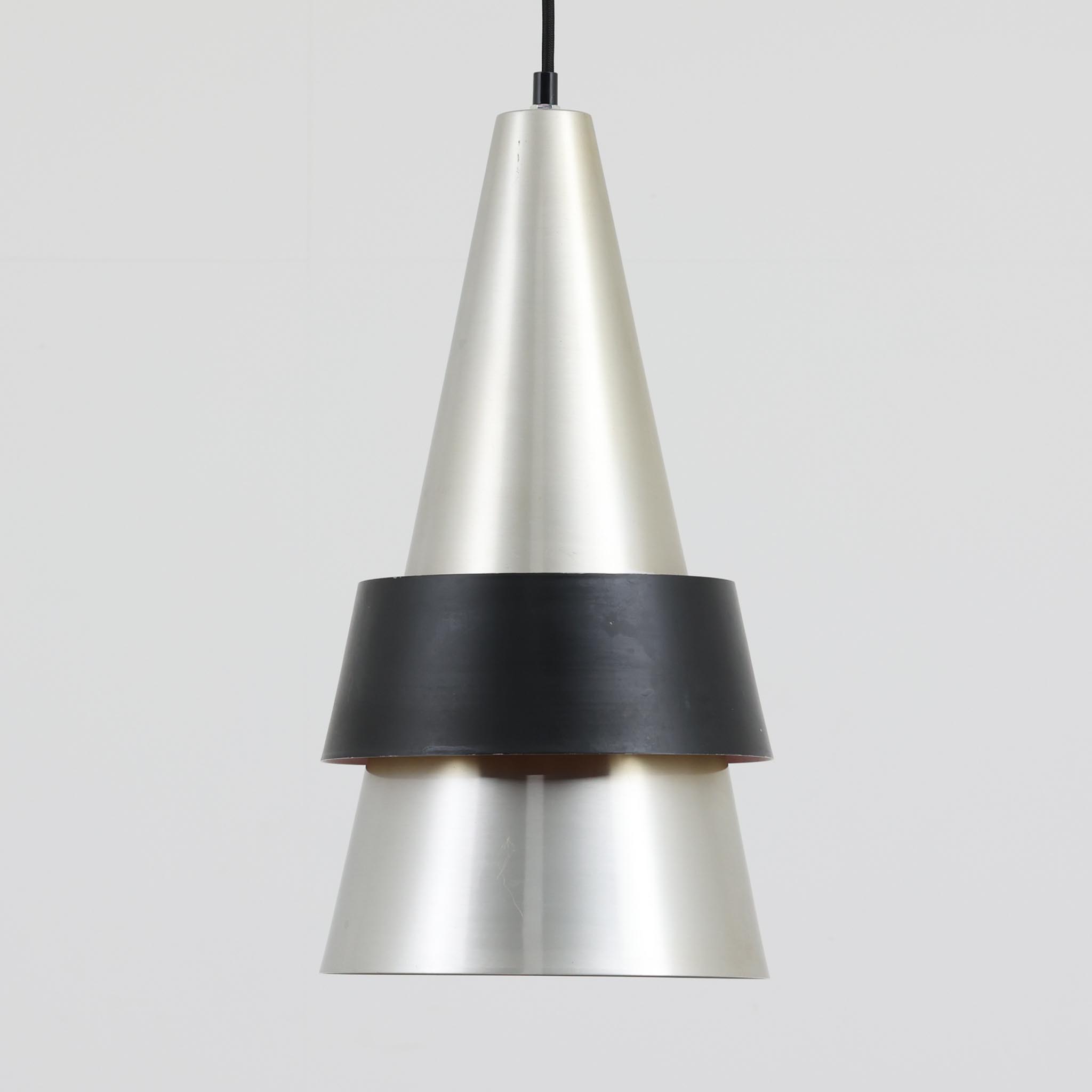 Jo HammerborgがFog & Morupのために手掛けた「Corona」は、直径22cmとコンパクトながら全高45cmと縦にしっかりとした存在感を持つアルミ×スチール製ペンダントライトで、上下に伸びる円錐形フォルムと中央のブラックバンドが彫刻的な印象を与える北欧ビンテージ品です。光源を囲む二重構造によって眩しさを抑えつつ下方向へ明かりを集中的に落とす設計となっており、ダイニングやカウンター上での1灯使用はもちろん、複数灯を並べても空間にリズムを生み出します。経年で深まった素材の風合いがハーマボーらしいモダンな佇まいを際立たせ、空間のアクセントとしても十分な存在感を発揮します。 商品コード DK19047 メーカー Fog & Morup(フォグ&モーラップ) デザイナー Jo Hammerborg(ヨー・ハーマボー) サイズ 本体:直径 220 × 高さ 450mmコード長:約110cm(引っ掛けシーリングから本体底面までのおおよそ)推奨電球:E26口金のLED電球×1(60〜100W形相当、600〜1600lm)、電球色、全方向タイプ※電球は付属しませんのでお客様にてご用意ください。本体重量:1.2kg(コード含む) 素材 アルミ、スチール 生産国 デンマーク コンディション シェードには細かな汚れ・擦り傷・わずかな錆が見られ、内側には使用に伴う色ヤケが見られます。ビンテージ品としては良好な状態です。※ビンテージ品です。お伝えしきれない細かい傷や使用感等が御座います。ご了承下さいませ。「メンテナンス内容」各パーツを取り外してクリーニング済みです。全ての電気部品は技術基準に適合するよう製造、修理しております。 仕上げ - お手入れ ほこりが付いた場合は柔らかいブラシ等でお掃除ください。通常の細かい汚れは、硬くしぼった布で拭いて下さい。 備考 ご注文前に必ず「お買い物前の注意事項」をご確認ください。※新しいウィンドウで開きます。技術基準適合済み、PSEマーク取得済みです。