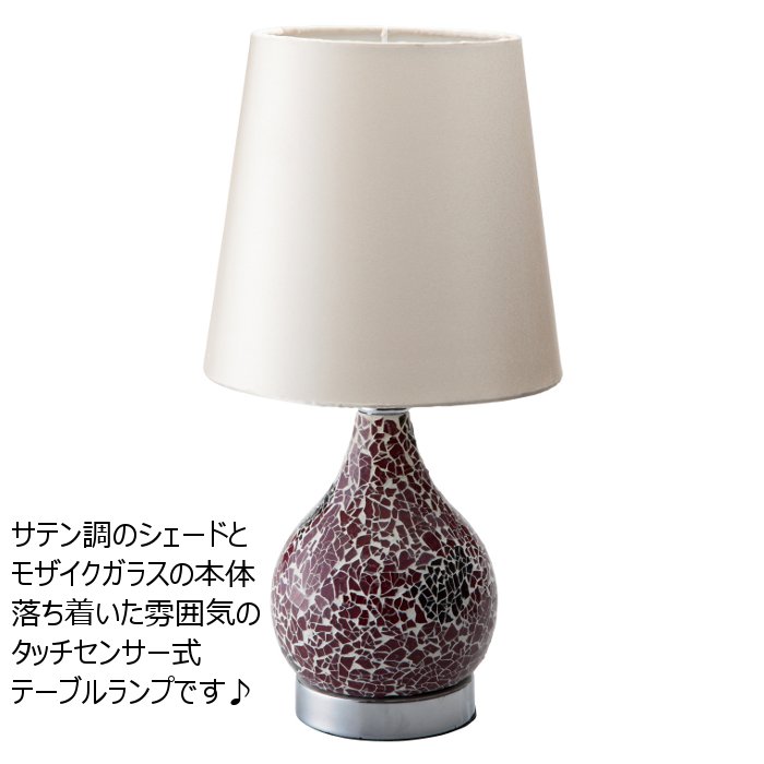 細かなモザイクガラスで装飾されたランプベースと、 サテン調のシェードが特徴のテーブルランプ。 昼は鮮やかな色のガラスモザイクでお部屋の雰囲気をアップ。 点灯時も灯に照らされるガラスモザイクがとても魅力的です。 タッチセンサー式スイッチなので、触るだけで オン・オフ、また明るさを3段階に調節できますので、 お引越し祝いや新築祝いなどプレゼントにもオススメです。 型 番:20605 品 名:タッチセンサーテーブルランプ モザイクベース カラー:レッド 材 質:スチール・ガラス・布 サイズ:約φ178x高さ345mm 電 源:AC100V 光 源:E17 40W 白熱電球(付属) ※省エネ電球(蛍光管・LED )はご使用になれません。 こちらの商品はメーカー直送でお届けします。 北海道・沖縄・離島の方は追加送料が発生しますのでご了承ください。 【代引き不可】 ご注文後、在庫確認をした際に品切れが判明した場合、ご注文をキャンセルさせていただく場合がございます。 あらかじめご了承くださいませ。モザイクガラスが個性を主張するタッチセンサーランプ
