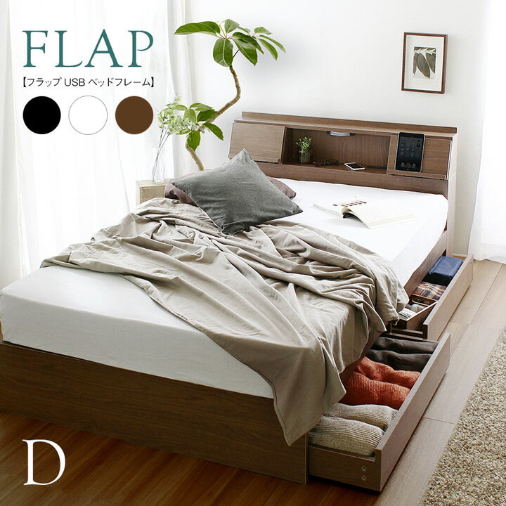 【ポイント7倍!今晩20時開始】【USB・コンセント付き】宮付き 多機能ベッドフレーム FLAP(フラップ) ダブルサイズ 3色対応 ダブルベッド フレーム単品 収納付き 収納ベッド LEDライト付き テーブル 木製 フロアベッド ローベッド ロータイプ