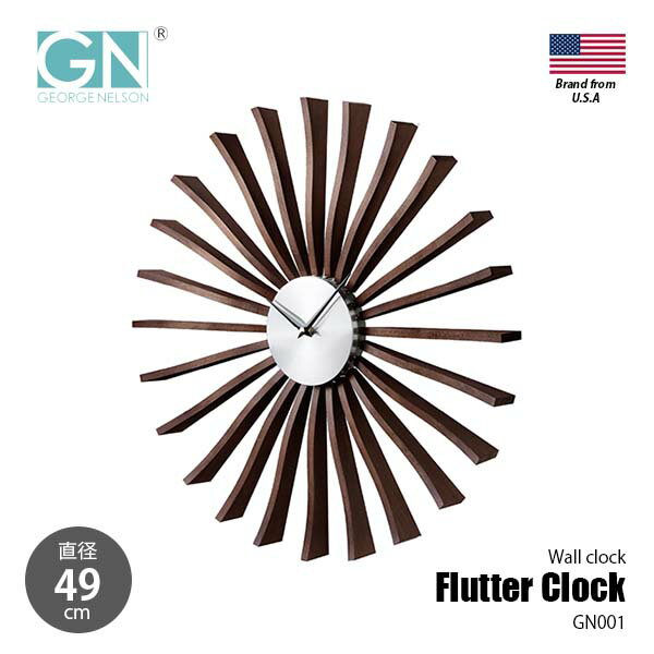 ミッドセンチュリーを代表するモダン・デザインの傑作ネルソンクロック。フラッタークロックは大型でありながら、圧迫感を感じさせない繊細で軽やかなデザインの掛け時計です。「フラッター」とは、はためき、羽ばたきの意。美しく仕上げれた24本の木のピースがおりなす緩やかでたおやかな曲線は羽根の羽ばたきや地に根を張る樹木のようでもあります。シンプルな中にミニマルでアートエレメントに溢れた一つの作品のよう。その佇まいは場所を選ばず、洋室だけでなく和室でもその存在感を発揮します。WALL CLOCK Flutter Clock フラッタークロック (掛時計) 木のピースがおりなすたおやかな曲線が美しい ミッドセンチュリーを代表するモダン・デザインの傑作ネルソンクロック。フラッタークロックは大型でありながら、圧迫感を感じさせない繊細で軽やかなデザインの掛け時計です。「フラッター」とは、はためき、羽ばたきの意。美しく仕上げれた24本の木のピースがおりなす緩やかでたおやかな曲線は羽根の羽ばたきや地に根を張る樹木のようでもあります。シンプルな中にミニマルでアートエレメントに溢れた一つの作品のよう。その佇まいは場所を選ばず、洋室だけでなく和室でもその存在感を発揮します。 - Features - Function Size 使い勝手とデザインとの調和を考慮したサイズ感を追求しています。 - Color/Variation - GEORGE NELSON Flutter Clock GN001 BR - ブラウン 仕様違いもございます。シリーズ一覧はこちら! - Specifications - ■サイズ(約) φ490×50mm ■重量(約) 0.76kg ■素材 パイン材、金属、他 ■秒針 無し ■電波時計 無し ■電源 単3乾電池 × 1 (付属) ※充電池はご利用いただけません。 ■原産国 台湾 ■公式輸入元 株式会社ケイ・コーポレイション(当店の販売製品は公式輸入元経由の正規品になります。) ※製品の価格、仕様等は予告なく変更する場合がございます。 予めご了承ください。 - Brand information - George Nelson ジョージ・ネルソン 1908 ~1986 U.S.A.コネチカット州ハートフォード生まれ。1931年にイエール大学で建築の学位を取り、さらにローマのアメリカン・アカデミーに留学。1935年に帰国後は建築ジャーナリストとして活躍した。1936年、ニューヨークで ウィリアム・ハンビーと建築事務所を設立。建築雑誌の編集長を務めたり、多くの建築・デザイン関連の著作を出版するなど、ミッドセンチュリーを代表する 建築デザイナー、編集者、作家、そして教師として、単にデザイン設計活動にとどまらない活躍を続けた。特に1946年からの20年間、ハーマンミラー社のデザイン部長として イームズ夫妻や イサム・ノグチの才能をモダン家具に実現させた功績は大きい。ネルソン自身も、マシュマロソファ、ココナッツチェアなどの名作や、高いアート性を有する ネルソンクロックシリーズで、デザイナーとしての足跡を残している。 その他、「GEORGE NELSON」の製品はこちら!