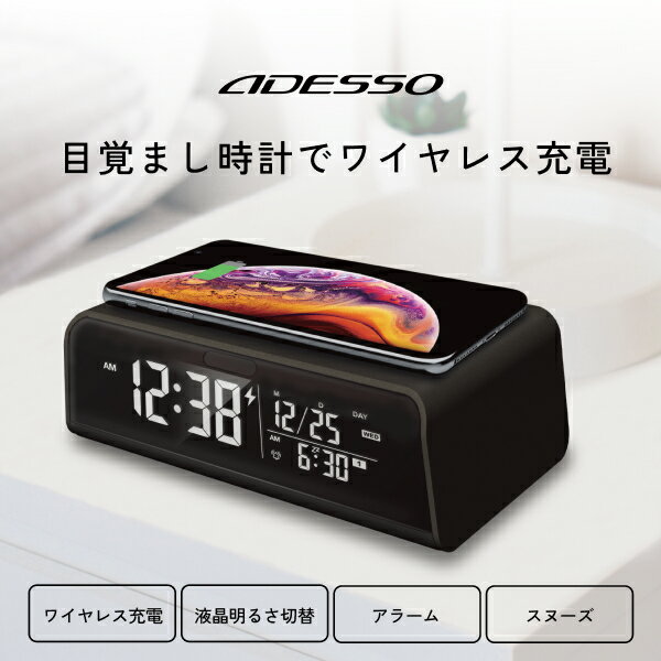 [有料ラッピング対応] スマホ充電 目覚まし時計 iPhone Android USBポート付き 2つ同時 カレンダー 日付表示 ワイヤレス アラーム スヌーズ おしゃれ デジタル 卓上 時計 電子 大画面 ADESSO プレゼント ギフト