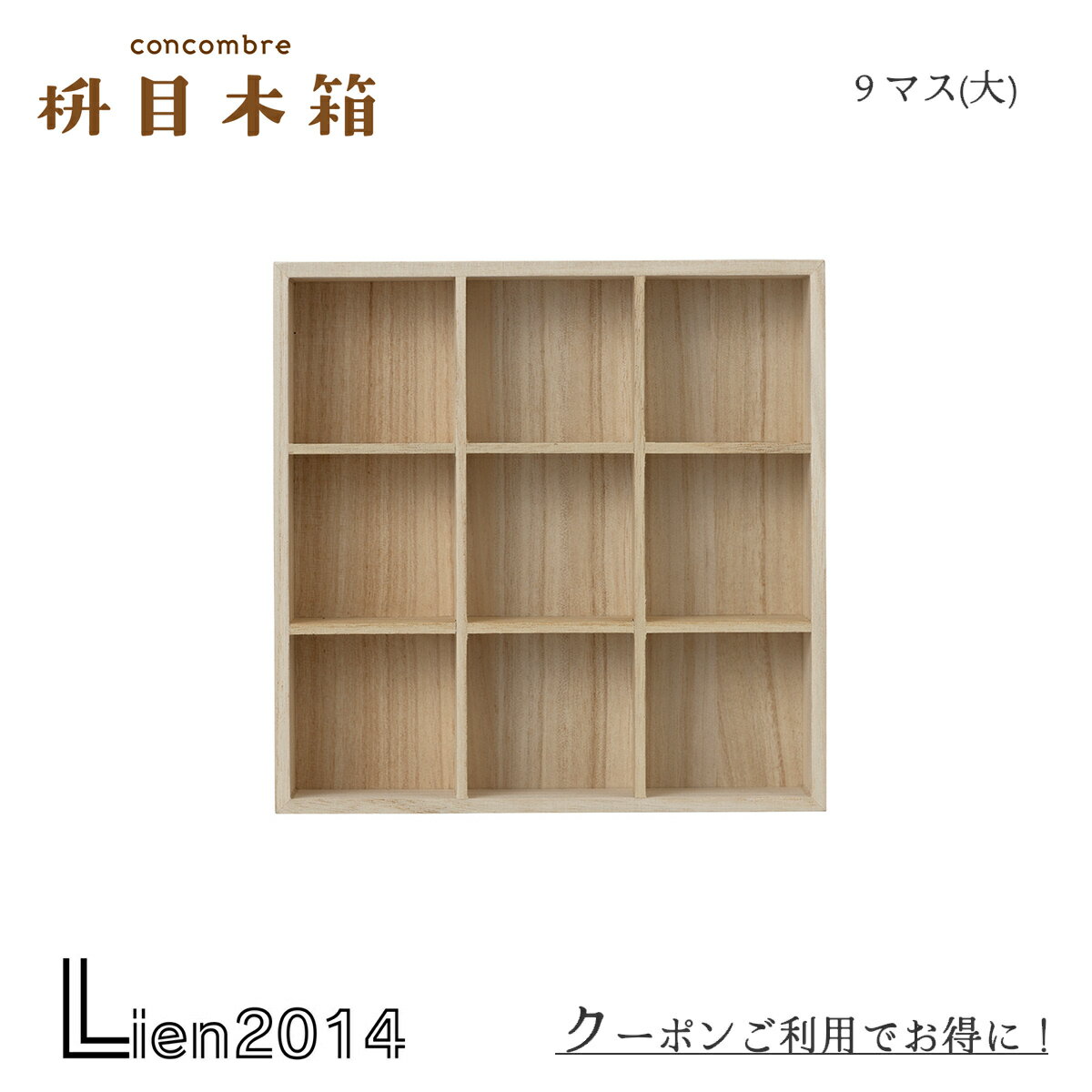 マスコットの居場所にぴったりな天然木の枡目木箱いろいろなマスコットに合わせて4タイプをご用意致しました居心地良さげな新築物件に入居希望者続出中!●マスコットは演出品です●天然木を使用していますので変形する場合があります●転倒防止金具は付属しておりませんので転倒が心配な場合は金具などで壁に固定してください●木製品につきロットにより多少色が異なりますクーポン利用でお得にゲット♪デスクや玄関先に飾ったり、リビングのインテリアにしてもOK。大きさは小ぶりなので、デスクに置いても邪魔になりません。concombreの仲間たちと一緒に飾ってストーリーを楽しんでみてはいかが?商品名:桝目木箱 9マス素材:木製サイズ:外寸/約204×45×高さ204cm 1マスの内寸/横:約60mm、縦:約60mm、奥行:約38mmデコレ商品についてこちらの商品は手作業による色付けの為、塗装ムラ・塗装剥がれ・塗装のはみ出し・小さな傷が見受けられる場合がございます。いずれもメーカー検品を通った良品となりますので、上記理由での返品・交換はお受けかねますので予めご了承ください。