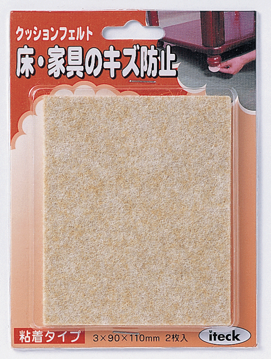 パッケージにキズ等がありますが、商品はキレイです!! ●おすすめポイント● 半硬質のクッションフェルトなので家具等の移動で床が傷つくのを防止します!! また、ハサミ等で簡単に裁断できるので必要なサイズにカットしていただき 粘着テープで貼るだけで便利にご使用いただけます。 【寸法】3mm×90mm×110mm 【入数】2枚