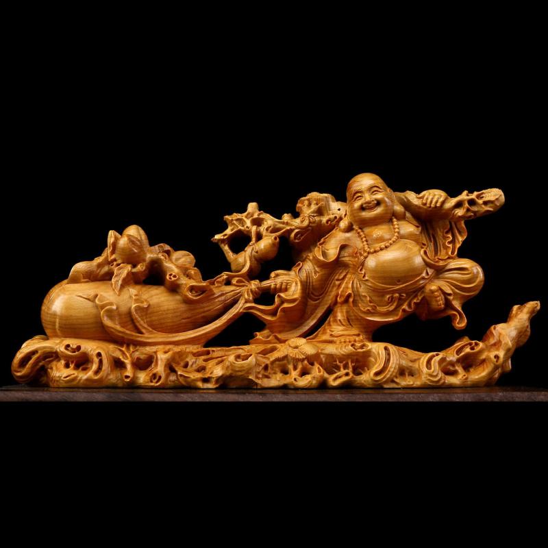置物 崖柏木彫り 布袋様 弥勒仏像 布袋引き 開運招福 金運招来 財運向上 精巧な彫刻 卓上サイズ インテリア オブジェ リビング 書斎 室内装飾 和モダン 風水 縁起物