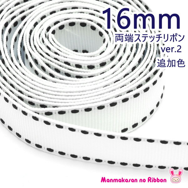 16mm 両端ステッチリボン 《ver.2》029White×黒ステッチ 2M [在庫限り]
