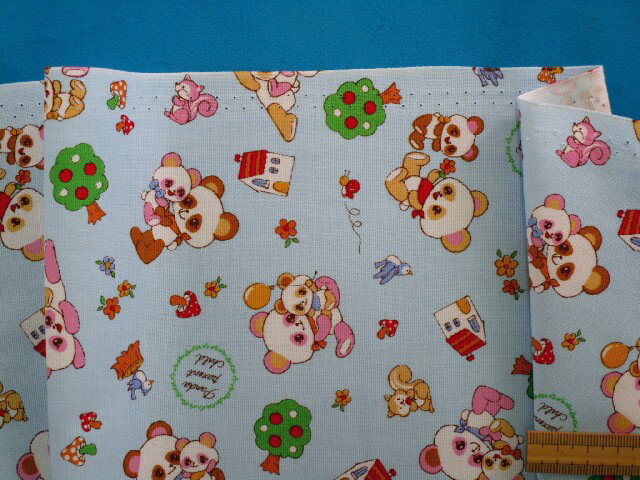 綿プリントオックス生地パンダ・水×グリン(110cm幅 1m)