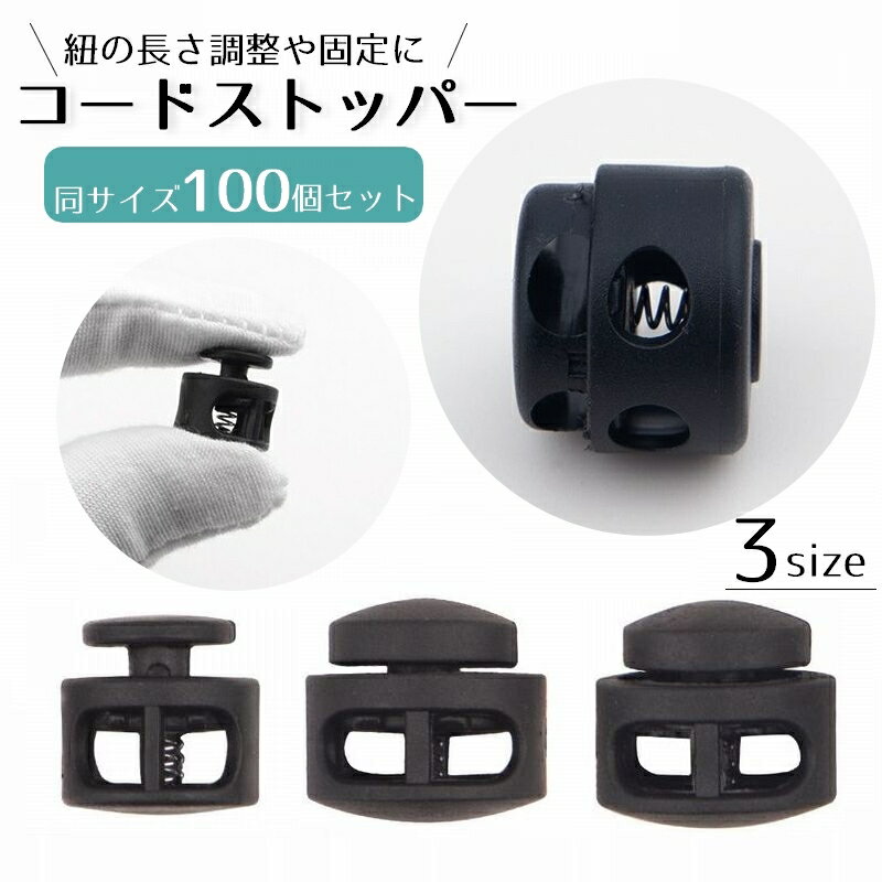 送料無料 コードストッパー 100個セット コードロック スプリング バックル ロック アクセサリー 紐止め 紐調整 長さ調整 補修 修理 交換 紐 ゴム紐 ロープ 帽子 スニーカー ブーツ フード ジャンバー シンプル ブラック 黒