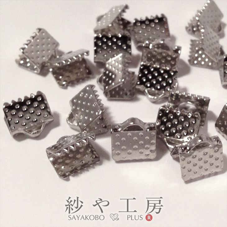 ハンドメイドアクセサリーパーツとして、レースやリボン、ヒモなど平たい資材を留めるための金具、留め具/止め具です☆留めたいリボンレースや紐などを口が空いた部分に挟みペンチで口を閉じて固定すると、ギザギザのワニグチ部分でしっかりとレースリボンが挟み込めます。上部には三角形の穴が開いていて丸カンなどを通すことができますので、キーホルダーや携帯ストラップからヘアアクセサリーまで、素敵なハンドメイド作品がサクッと手軽に作れちゃいます♪使い方、作り方を考えるだけでも楽しくなってしまう、アイデア次第でハンドメイド作品の幅が広がりますね♪サイズ(大きさ)とカラー(色)を沢山取り揃えておりますので、作り方や使い方、用途によってお選びいただけます^^※同じ商品でも入荷時期等により、サイズ・色調・メッキ等の仕様に若干の変更・個体差がある場合がございます。※細かな擦り傷などのダメージがある商品が入ることがあります。※照明・モニターの関係上、多少お色味が変わる事がございます。紗や工房のパーツは商用利用が可能です♪ぜひ素敵なアクセサリーに加工して販売してください♪【内容詳細】さや工房 レース留め金具 30個セット【サイズ】8mm 0.8cm【カラー】ロジウムカラー シルバー【素材】鉄※商品には細かなキズ・スレ等ダメージなどがある場合がございます。通販の性質上、お使いのPCによっては多少商品イメージ画像と色味が異なる場合がございます。▼金属アレルギー対応素材について詳しく知りたい方はコチラ▼▼▼お家でハンドメイドデビューしよう♪▼▼