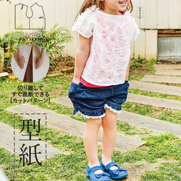 個人でハンドメイド・手作りを楽しんでいただくための型紙です。 二次利用(使用、転載、販売など)する事を一切禁じます。 ・型紙 / パターン ※メーカー希望小売価格はメーカーカタログに基づいて掲載しています。 ・布(エコファブリック) ※メーカー希望小売価格はメーカーカタログに基づいて掲載しています。アイドル気分になれる、ミニ丈のプリーツスカートタイプ。 ツイルやデニムで作るときは、 中のパンツはブロードやダンガリーなどを使うとかさばりません。 ●必要な材料 ・表布A 110cm幅 90サイズ 70cm 100サイズ 70cm 110サイズ 70cm 120サイズ 80cm ・表布B 110cm幅 90サイズ 50cm 100サイズ 50cm 110サイズ 50cm 120サイズ 50cm ・ゴムテープ 3cm幅 90サイズ 40cm 100サイズ 50cm 110サイズ 50cm 120サイズ 50cm ・レース 3cm幅 90サイズ 100cm 100サイズ 110cm 110サイズ 120cm 120サイズ 120cm ※裁断図は110cm幅のみ表記 ●できあがりサイズ ・着丈 90サイズ 25.5cm 100サイズ 27.5cm 110サイズ 29.5cm 120サイズ 31.5cm 《CUTPATTERNとは?》 従来の型紙製品のように型紙を別紙に写す必要なんて不要。 型紙の外周に入っている、ミシン目を切り離すだけで、すぐ裁断へ取り掛かれます。 ソーイング初心者にやさしい、縫製説明レシピ付き。 一枚、一枚、機械で折らず、人の手によって折られています。 個人でハンドメイド・手作りを楽しんでいただくための型紙です。 二次利用(使用、転載、販売など)する事を一切禁じます。