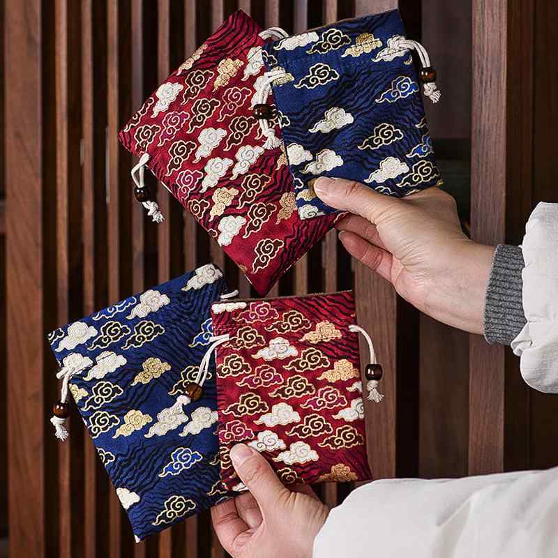 巾着袋 綿麻 金箔押し チャイナ風 アクセサリー ジュエリー 数珠 念珠 ブレスレット ビーズ くるみ コレクション 小物 収納 ポーチ 普段使い トラベル 旅行用 かわいい 高級感(x2)