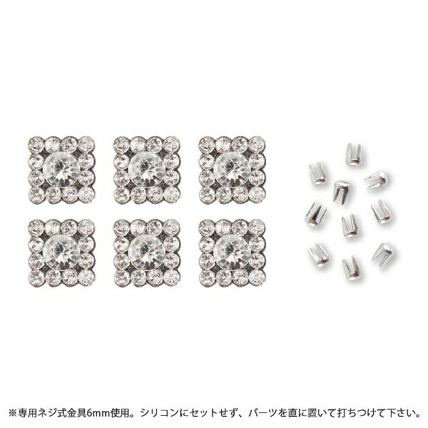 「reveリ〜ノ」は、サロンビジネス(お教室)を展開している『k i k i』が考案したクラフトです。 専用マシンを使って、どなたでも簡単に力をかけることなく付けられます 様々なサイズのパールを組み合わせて、お手持ちのバッグやお洋服などにアレンジを施すことができます。 ◇リベリーノ専用のパーツ(スパイク付き)です。 ◇シャープな印象になるスクエアタイプのパーツです。 ◇カラー:クリスタル ◇サイズ:パーツ W10×H10×D5mm スパイク W2×H3mm ◇10ケ入 ◇専用ネジ式金具 6mm使用 使用上の注意 ※取り付け可能な生地の厚み:最大約1.5mmまで ※目の粗い生地等、素材により外れる場合があります。 ※使用される生地で試してからご使用下さい。 備考 ※洗濯可。 ※ドライクリーニング不可。 ※専用マシンは別売りとなります。