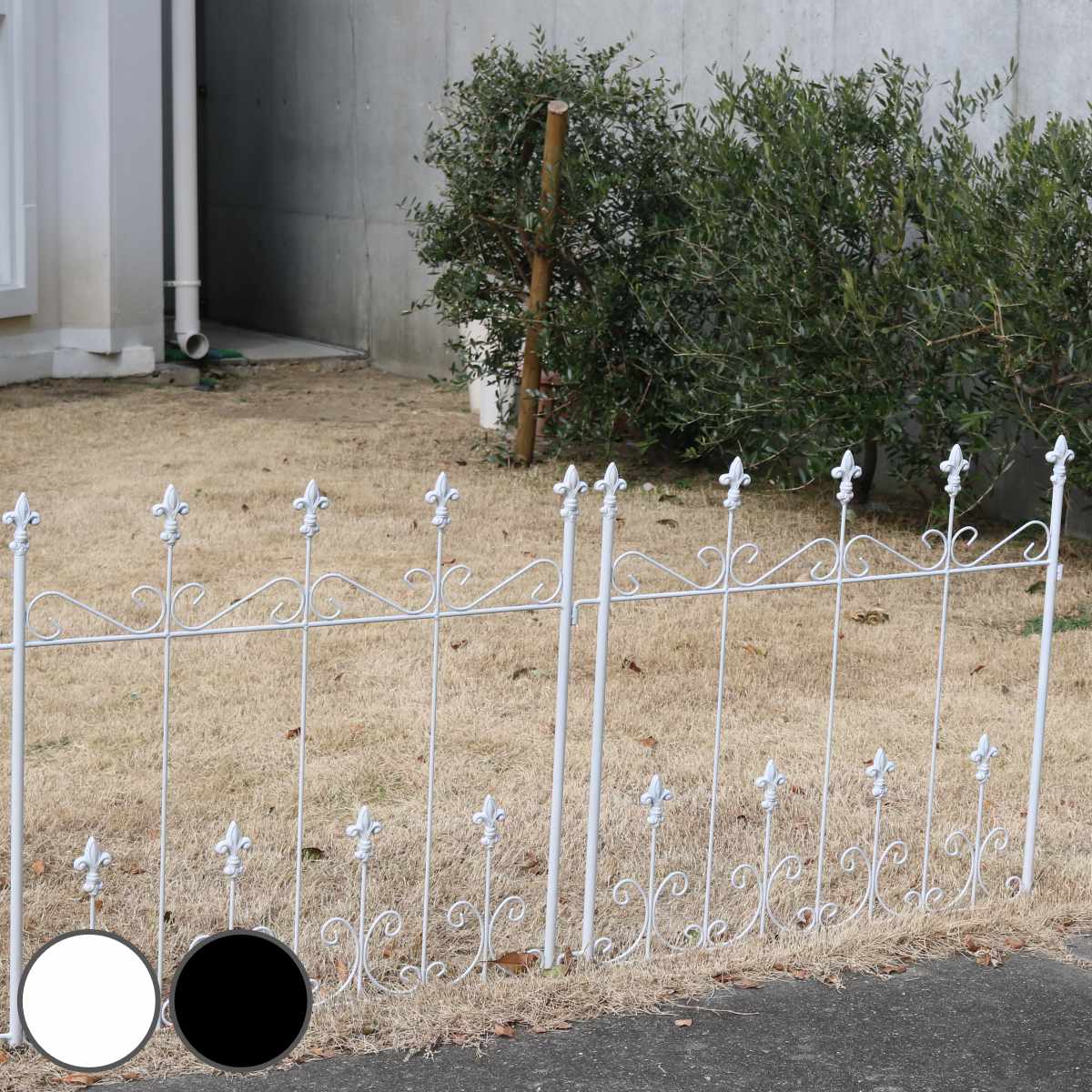 サイズ約 幅72×奥行1.5×高さ92(cm)(1枚あたり)重量約 2.2kg内容量4枚組材質スチール(粉体塗装仕上げ)種類ブラック、ホワイト組立状態お客様組立品注意事項※基本的に埋め込み部分をしっかり埋め込んで頂ければ自立しますが、柔らかすぎる地面などでは倒れる恐れがありますので、お客様自身で固定いただくか、ご使用をお避けください※商品ページ内には別の商品を含む画像を使用しています備考組立時間:2人で20分区分返品・キャンセル区分(不可)フェンス オールドシャトーフェンス ミニタイプ 4枚組おすすめポイントアンティーク風フェンス(ミニタイプ 4枚組)深い森の中に建つ石造りの古城…そんな雰囲気を漂わせる、繊細で風雅なデザインのアイアンフェンスです。これ一つで本格的なクラシック・スタイルのお庭になります。しっかり差し込むと頑丈なので、隣家との間仕切りとしてもお使いいただけます。花壇やグリーンカーテンに何もない場所に、グリーンフェンスや花壇を簡単に作ることができます。植物の成長にあわせて動かせるので、常に最適なポジションでお使いいただけます。商品詳細地面に挿すだけで自立地面に挿すだけの簡単設置で、買ってすぐに使えます。ハンマーでたたくためのペグがついているので、固い地面でもしっかり埋め込むことが可能です。主役を引き立てるデザイン開放感のあるデザインなので、主役である花をしっかりと引き立てて、ドラマティックな彩りを添えてくれます。季節のデコレーションにもクラシックテイストのアイアン素材なら、置くだけで華やかな印象になります。クリスマスイルミネーションや、ハロウィンデコレーションでも活躍します。カラーサイズご注意点単品・セットの購入はこちら8枚組4枚組サイズ違いハイタイプ 4枚組ロータイプ 4枚組スリムタイプ 4枚組ミニタイプ 4枚組スティックタイプ 4枚組関連キーワード:ガーデニング用品 アンティーク加工 カフェ 店舗 挿す 挿し込み 差し込み オーナメント インダストリアル ヴィンテージデザイン ヴィンテージ クラシック デザイン 加工 レトロ シャビー ハンドメイド 玄関先 玄関 インテリア雑貨 庭先ビンテージ オシャレ スタイリッシュ 園芸グッズ 園芸用品 園芸 ガーデニンググッズ 置き物 おすすめ オススメ LH15564 関連商品はこちらフェンス オールドシャトーフェンス ミニタイプ23,900円フェンス オールドシャトーフェンス スリムタイ11,800円フェンス オールドシャトーフェンス スティック7,800円フェンス オールドシャトーフェンス スリムタイ6,600円フェンス オールドシャトーフェンス スティック14,200円フェンス オールドシャトーフェンス 高さ22024,800円フェンス オールドシャトーフェンス 高さ15618,900円フェンス オールドシャトーフェンス 高さ1569,800円フェンス オールドシャトーフェンス 高さ22012,800円フェンス アイアン ローズフェンス 高さ15126,800円フェンス アイアン ローズフェンス 高さ21929,800円フェンス アイアンフェンス 高さ220cm ハ24,900円