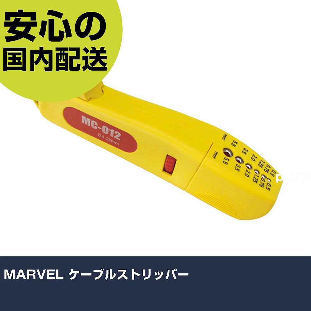 手作業工具 電設工具 -------------------------------------メーカー名(株)マーベルプラス名称 MARVEL商品名MARVEL ケーブルストリッパー型式MC180メーカー希望小売価格【税抜】5300円(税抜)オレンジブック2026年 5 0178ページ発注コード116-0015JANコード4992456207248特長●電線サイズによる刃先の調整が不要です。●本体は軽量で強度の強いガラス繊維強化ポリアミド製です。●ハンドルロックでコンパクトに収納可能です。用途●ビニール系丸型電線の皮むきに。仕様●適合電線([[MM2]]):0.3〜5.5●全長(mm):170●適合電線:IV●色:黄色●ストリップ長(mm):5〜12材質●ガラス繊維強化ポリアミドセット内容/付属品注意原産国ドイツ重量137G納期目安当日〜2営業日以内に発送 ※欠品時別途連絡