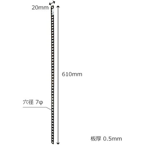 帯鉄に穴をあけたプレート。穴が多く自在に取付可能。建築等に。【サイズ】長さ(mm):120 幅(mm):20 板厚(mm):0.8【材質】鉄【仕様・タイプ】穴径(φmm):4