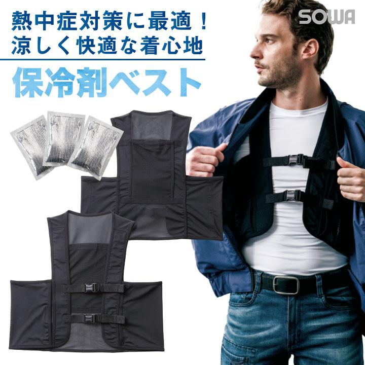 保冷剤ベスト 熱中症対策 消臭加工 冷感 ストレッチ 風通しがいい 保冷剤付き 調整可能 SOWA 桑和 春夏 ベスト sw-80056