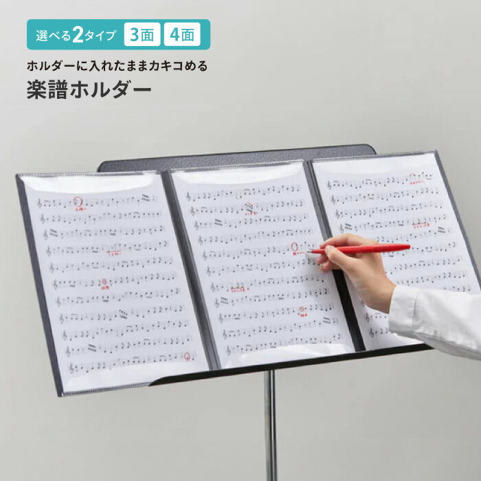 カキコ 楽譜ホルダー ホルダーに入れたままカキコめる! 「カキコ」シリーズに楽譜の収納・閲覧にぴったりな楽譜ホルダーが新登場! 書類をホルダーに入れたまま書き込める機能はそのままに、表紙がフラットに開いて反発しづらい仕様です。 ふだんの練習から演奏会やコンクールなどの本番まで、快適な演奏をサポートします。 「カキコ」シリーズはポケットの上下についたフラップで書類を挟む形状で、書類をホルダーに入れたまま文字などを書き込むことができます。 楽譜や不動産資料、打ち合わせ資料など、頻繁に文字を書き込みたい時に便利です。 ●ファイルメーカーならではのこだわり仕様 空調などの風の影響も受けにくく、フラットに開いて使い心地を損なわない厚みのPPシートを採用。丈夫さと使いやすさを両立する、ファイルメーカーならではの仕様です。 程よい厚みのため軽く、持ち歩く際にもストレスになりません。 ●シーンを選ばないシンプルなデザイン 黒一色のシンプルなデザインと、ツヤを抑えた上品な質感を実現。 本体にはペンを楽譜と一緒に持ち運べる切り欠きもついており、メモをしたいときにペンを取り出してすぐ書き込めます。 練習から本番まで、楽器ユーザーに寄り添う楽譜ホルダーです 商品サイズ/A4タテ型 色/黒 【楽譜ホルダー 3面】 外形寸法 約225(W)×308(H)×10(D)mm 展開寸法 約683(W)×308(H)mm 【楽譜ホルダー 4面】 外形寸法 約225(W)×308(H)×16(D)mm 展開寸法 約914(W)×308(H)mm 主な材質 PP ※製品の仕様は予告なく変更する場合があります。予めご了承ください。 ※画像はイメージです。実際の商品とは多少異なる場合があります。