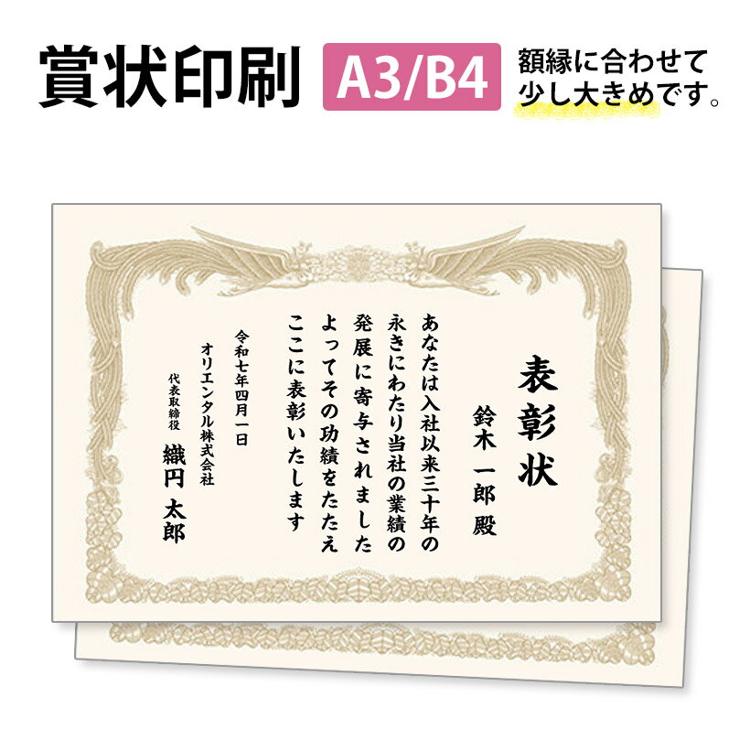 ●原稿を弊社宛にお送り下さい。例文からメール画面を開いて編集もできます。 Eメール:info@the-oriental.co.jp ●用紙サイズと、枚数などを選択しご注文下さい。 ●原稿とご注文を受付次第、当日から営業日の中2日以内に校正PDFをメールに添付してお送りします。 「修正なし」の返信を頂きましたら、営業日の中2日以内に印刷・発送致します。 ●タテ書きの数字は漢数字に変換します。 ●賞状の句読点「、。」は省略されていますが原稿で書かれている場合はその通りに反映します。 ●レイアウトは文字数によって適宜調整致します。 ●書体は楷書体です。他の書体は備考欄で指定頂きましたらご希望に近い書体に変更致します。 寸法 B4:390x266mmA3:436x310mm※正寸サイズ(JIS規格)と異なる為、寸法をご確認の上ご購入ください。※額縁に合わせて、B4(364×257mm)、A3(420×297mm)より少し大きめです。 紙厚 0.26mm 坪量 215g/平方メートル 髪質・カラー ケント・クリーム