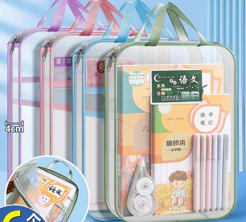 ファイルケース 持ち運び L字 科目 分類 バッグ 透明 クリア 書類 ファスナー メッシュ 大きな 開口部 学生 収納 3層 ラベル 緑 青 黄色 雑貨