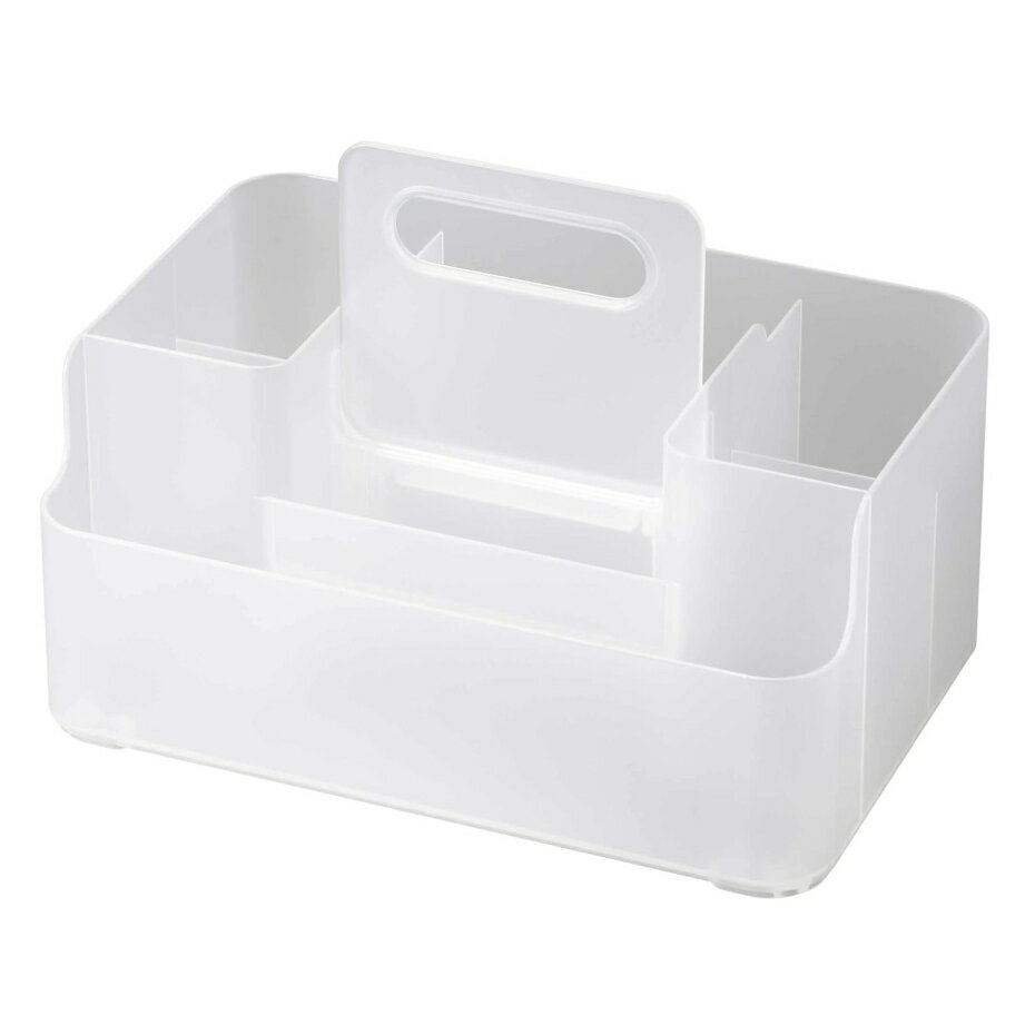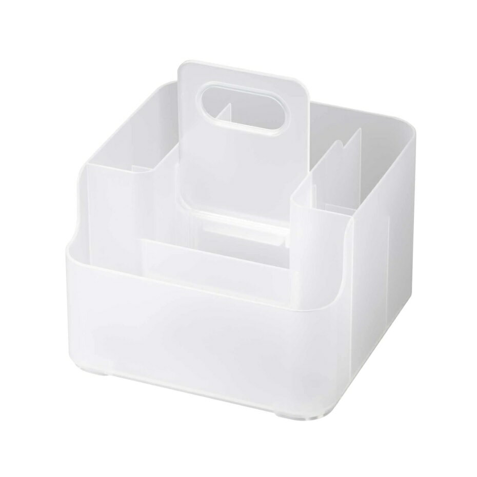 商品説明 ●いつもそばに持ち運べるキャリーボックス デスク周りやメイク用品など、細々としたモノの整理にぴったりな収納ボックスです。 ●出し入れのできる握りやすい取っ手でラクラク持ち運び 握りやすい丸みのある取っ手付き。片手がふさがっている状態でも、もう一方の手で手軽に持ち運ぶことができます。 取っ手は出し入れが可能なので、取っ手を下ろして引き出しの中にボックスごと収納することもできます。 ●細かく仕分けできるから細々したモノの整理にぴったり Sサイズは7部屋に仕切られているので、細かく仕分けできます。ペンやハサミ、リモコンなど横に倒さずに立てて収納することができ、使いたいときにサッと取り出すことができます。 ●見つけにくい小さなモノは取り出しやすい浅い部屋に 取り出しにくかったり迷子になってしまいやすい消しゴムやリップなどの小さなモノは浅い部屋に。取り出しやすいように、手前側の壁が曲線になっているのもポイント。 ●積み重ねできるので省スペース収納に 収納したまま積み重ねができます。デスクの上などあまりスペースがとれない場所でも、積み重ねることですっきりと片付けられます。 ●プラスチック製なので丸洗いできて いつも清潔 汚れても、布などでサッと拭き取ればOK。丸洗いもできるのでいつも清潔を保てます。赤ちゃんのケア用品入れや救急箱、掃除用品入れにもぴったりです。 商品規格 ■商品サイズ 幅15.7×奥行15.7×高さ10.6cm ハンドル使用時高さ 16.1cm ■商品重量 253g ■ハンドル耐荷重 3kg ■材質 本体・ハンドル:ポリプロピレン ■原産国 日本サンカ ナチュラ ツールピット S NTP-S CL クリア 【幅15.7×奥行15.7×高さ10.6cm】 いつもそばに持ち運べるキャリーボックス 出し入れのできる握りやすい取っ手でラクラク持ち運び 細かく仕分けできるから細々したモノの整理にぴったり 見つけにくい小さなモノは取り出しやすい浅い部屋に 収納したまま積み重ねができます。デスクの上などあまりスペースがとれない場所でも、積み重ねることですっきりと片付けられます。 土・日を除く 【1~3営業日以内】 に発送1