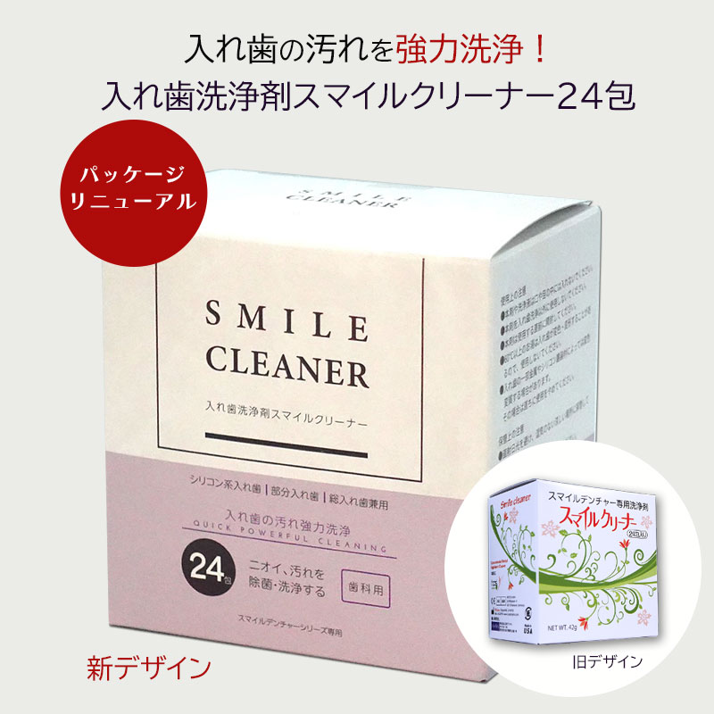 ■パッケージリニューアル変更のお知らせ■ この度、スマイルクリーナー粉末タイプ 24包のパッケージデザインを変更いたします。内容の変更はございません。順次新パッケージに切り替えてまいります。今後ともよろしくお願い申し上げます。 スマイルデンチャー専用洗浄剤 弱酸性 シリコン系入れ歯・部分入れ歯・総入れ歯にご使用いただけます。 使用及び保管上の注意 使用上の注意 ・錠剤や洗浄液は口や目の中には入れないでください。 ・本剤を入れ歯洗浄以外に使用しないでください。 ・本剤は使用する直前に開封してください。 ・60℃以上のお湯は入れ歯が変色・変形することがあるので、使用しないでください。 ・入れ歯の一部金属やシリコン裏装材によっては変色・変質する場合があります。 その場合は直ちに使用をやめてください。 応急処置 ・誤って目に入った場合は流水で洗い流してください。 ・誤飲した場合は水や牛乳などを飲んでください。その上で本品を持参の上、医師にご相談ください。 保管上の注意 ・直射日光のあたる所、高温多湿となる所には保管しないでください。 ・幼児の手の届かない所に保管してください。 成分 過硫酸カリウム、硫酸カリウム、硫酸水素カリウム、炭酸マグネシュウム、クエン酸、ペパーミントエキス、ペルオキシニ硫酸カリウム、スクロース 使用方法 毎日の洗浄で、スマイルデンチャーを綺麗な状態に保つことができます。 1.入れ歯は流水で充分すすぎます。 2.約200mlのぬるま湯(40~50℃)に、スマイルクリーナーを1包分を溶かし3分待ちます。 ※60℃以上のお湯で使用しないでください。 2.出来上がった洗浄液に、スマイルデンチャーを30分つけ置き洗いします。 ※特に汚れがひどい場合は、一晩浸して置くと効果的です。 3.つけ洗いした入れ歯は、装着前に流水で充分にすすいでください。 ※一度作った洗浄液は、冷暗所に保管し約一週間お使いいただけます。 容量 1.75g×24包 メーカー SANWA 株式会社三和デンタル /東京都大田区東嶺町32-21 商品区分 入れ歯洗浄剤 原産国 日本 商品名 [入れ歯洗浄剤スマイルクリーナー24包]SMILE CLEANER 1.75g×24包 広告文責 株式会社三和デンタル 03-3750-7144 ご注意 お使いのモニターの発色具合によって、実際のものと色が異なる場合がございます11