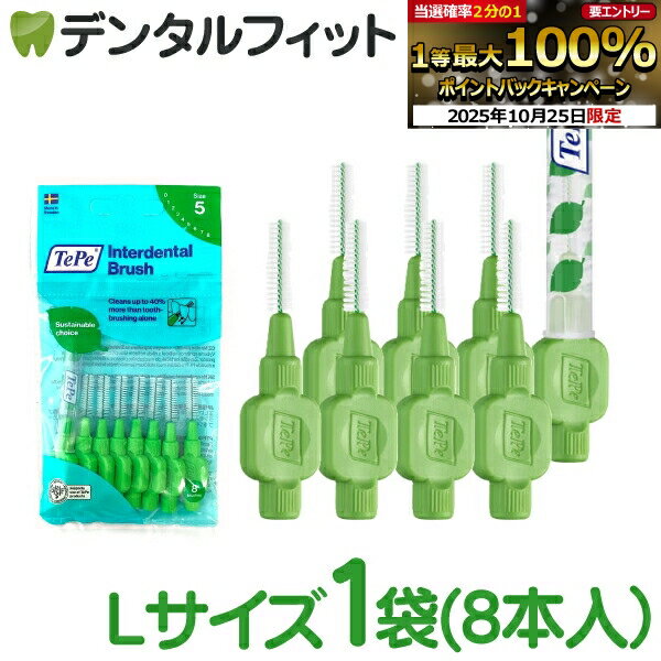 TePe インターデンタルブラシ L Tepeの歯間ブラシ。 付属のキャップは、ブラシを守ることはもちろん、後部に付けることで持ち手としてもご使用いただけます。 【サイズ】L(最少通過径:1.6mm) 【ワイヤ径】0.8mm 【カラー】グリーン 【ブラシ部長さ】18.0mm 【製造国】Sweden 【内容】8本(キャップ1個) 【ご注意(免責)事項】 当店では、サイト上に最新の商品情報を掲載するよう努めておりますが、メーカーの都合等により、商品規格や仕様(容量・成分・パッケージ・原産国など)が予告なく変更される場合がございます。このため、実際にお届けする商品と商品ページ上の情報表記が異なる場合がございますので、ご使用前には必ずお届けした商品の商品ラベルや注意書きをご確認ください。また、商品情報についてページ表記以外の詳細が必要な場合は、メーカー等にお問合せください。単品買いならこちらがおススメ!ポスト投函が便利な送料無料ページはこちら
