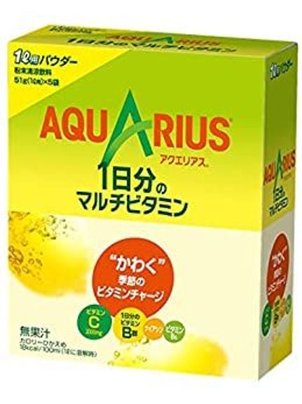 スポーツ飲料「アクエリアス(Aquarius)」は、1983年4月に発売を開始しました。その名前は、英語で星座の水がめ座を意味します。また、Aquaにはラテン語で、水、液体の意味があり、水分や電解質などをカラダに供給するアイソトニック飲料のイメージにピッタリの語感をもっています。水分補給と合わせて1日分のマルチビタミンが手軽に摂れる。カロリー控えめ爽やかでおいしいレモンの味わい。アクエリアス1日分のマルチビタミンパウダー カラー . サイズ . 素材 糖類(砂糖、ぶどう糖)、塩化Na/ ビタミンC、クエン酸、クエン酸Na、香料、塩化K、乳酸Ca、ナイアシン、甘味料(アセスルファムK)、マリーゴールド色素、ビタミンB6 原産国 日本 メーカー品番 66708553 コメント スポーツ飲料「アクエリアス(Aquarius)」は、1983年4月に発売を開始しました。その名前は、英語で星座の水がめ座を意味します。また、Aquaにはラテン語で、水、液体の意味があり、水分や電解質などをカラダに供給するアイソトニック飲料のイメージにピッタリの語感をもっています。水分補給と合わせて1日分のマルチビタミンが手軽に摂れる。カロリー控えめ爽やかでおいしいレモンの味わい。