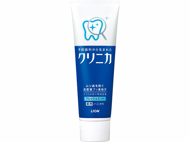 ※画像はイメージです。パッケージデザイン等は予告なしに変更されることがあります。※メーカーの欠品や製造中止により納期遅延、またはお届けできない場合がございます。メーカー都合によりパッケージ・原材料・成分内容等が予告なく変更となる場合がございます。予めご了承下さい。メーカー名:ライオン商品名:クリニカ フレッシュミント タテ型 130g●「クリニカ フレッシュミント タテ型 130g」は、ムシ歯の発生と進行を防ぐ、フッ素が長く留まる処方の酵素配合歯磨きです。独自の「高密着フッ素処方」でフッ素を歯面に長く留めて、エナメル質の再石灰化を促進します。酵素配合。歯垢を分解・除去します。爽快なフレッシュミント香味。医薬部外品。